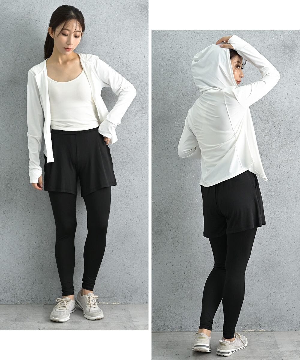 フードと指穴付きで首元・手の甲までしっかりUVカット(UPF50+・95%以上)。