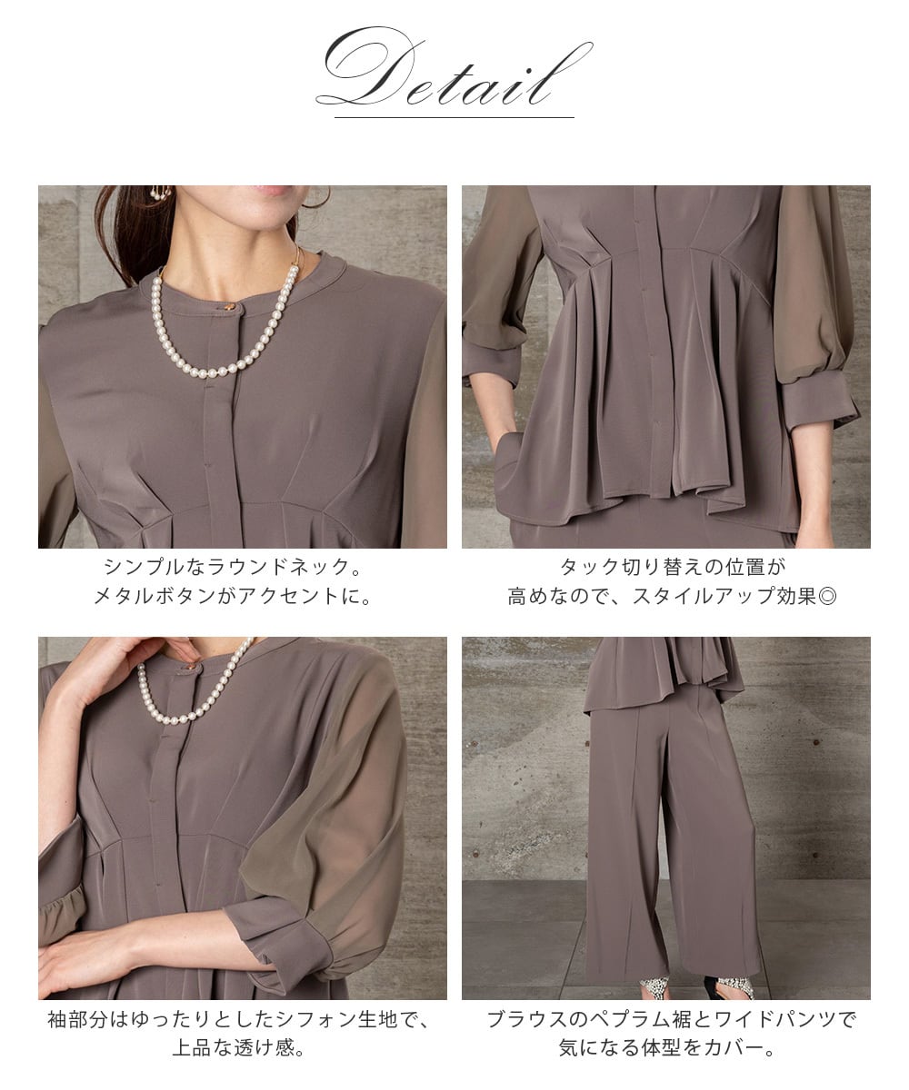 落ち着いた印象で、フォーマルシーンで着回せるワイドパンツセットアップ。