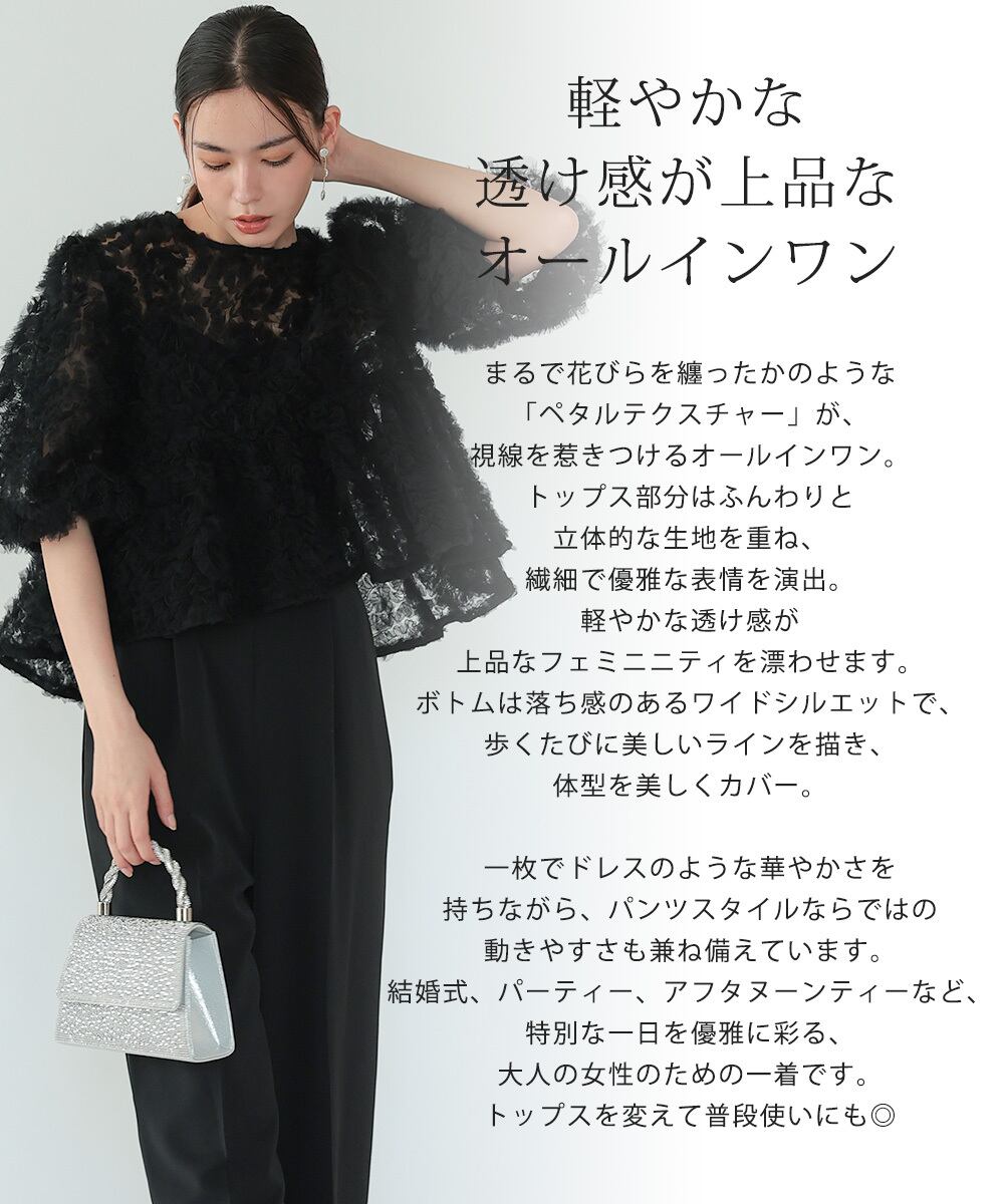 まるで花びらを纏ったかのような「ペタルテクスチャー」が、視線を惹きつけるオールインワン。