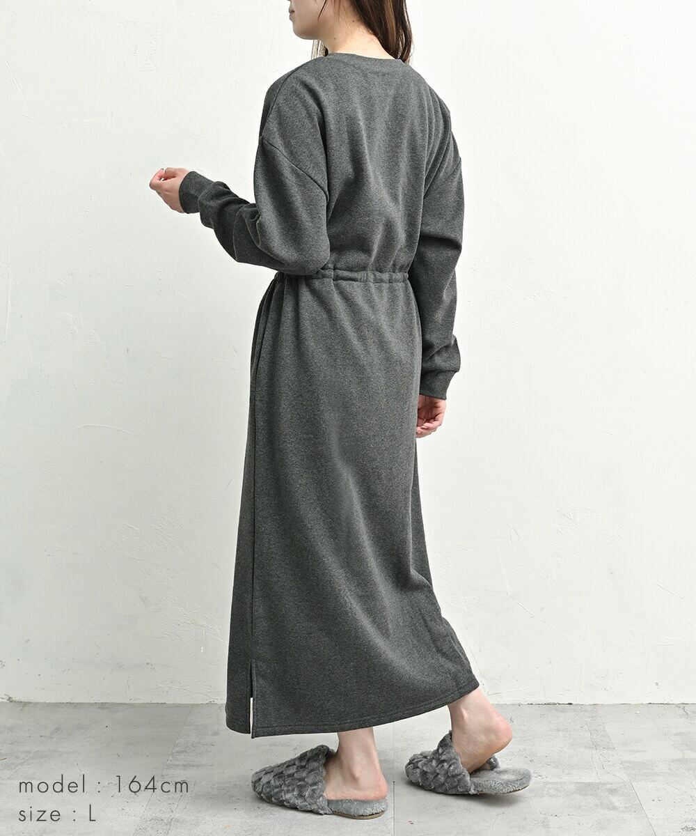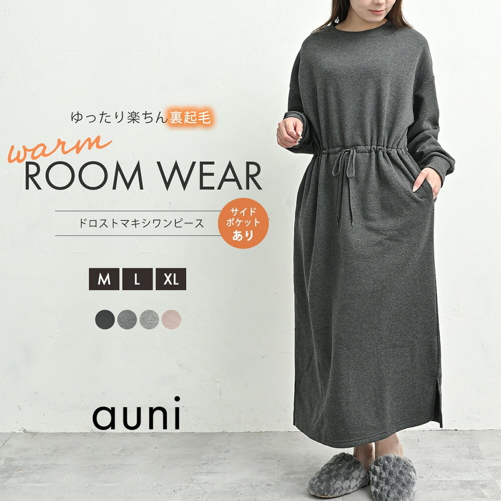 裏起毛 ワンピース ルームウェア パジャマ レディース 秋 冬 マタニティ 暖かい 長袖 ロング マキシワンピース ドロスト ラウンドネック 部屋着 ゆったり おしゃれ かわいい おでかけ ワンマイル ギフト 贈り物 プレゼント ab8333 | AUNI_BELLES