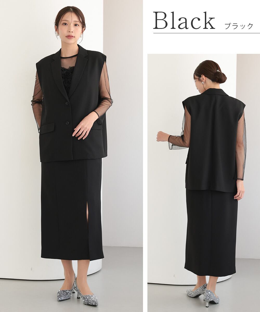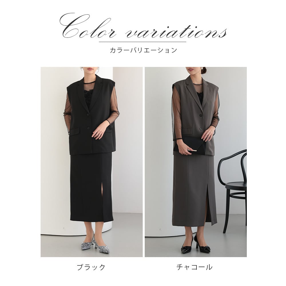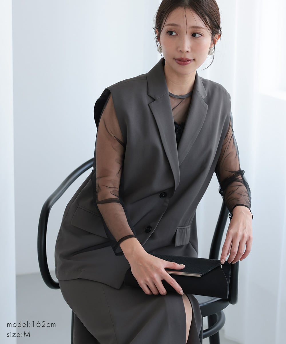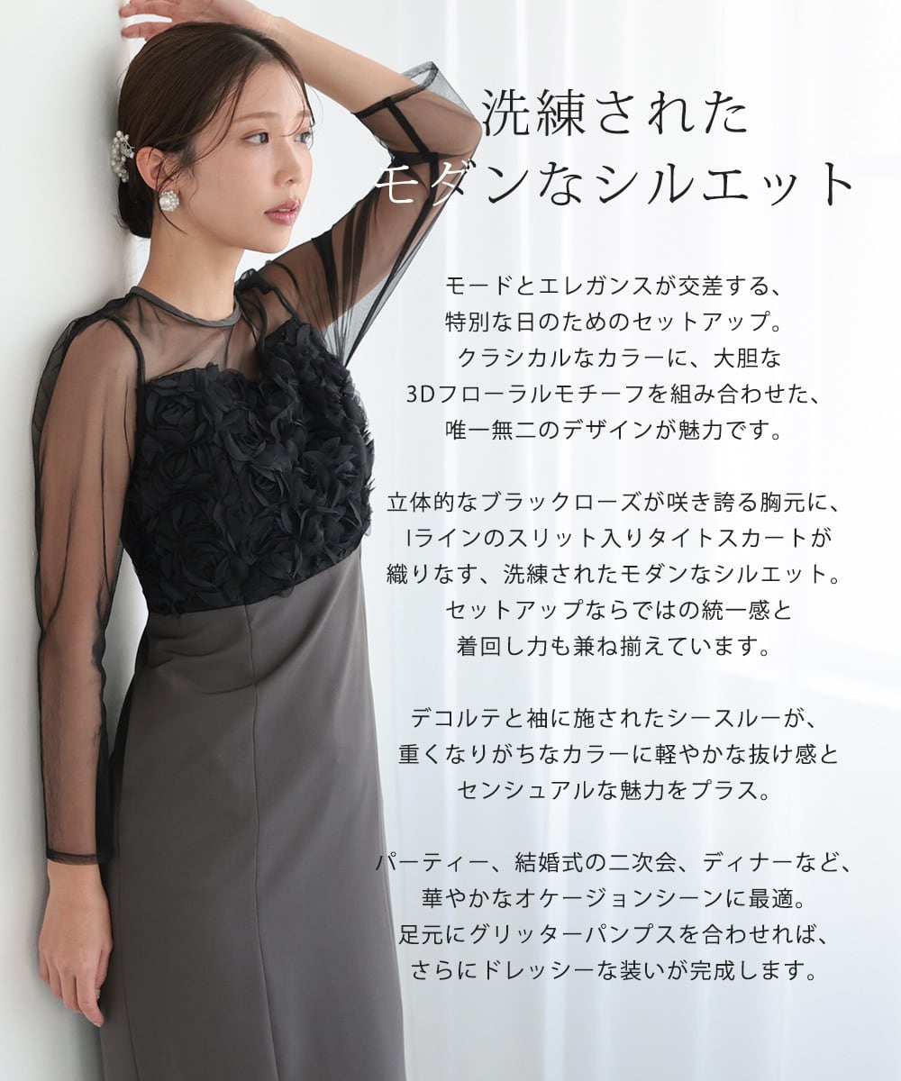 結婚式 ドレス パーティードレス ワンピース ジレ 2点セット オケージョンドレス 重ね着 レディース 秋 オケージョン 個性的 フリル 体型隠し 結婚式ドレス お呼ばれ 袖あり 長袖 ロング シアー S M 黒 チャコール 325279 | AUNI_BELLES