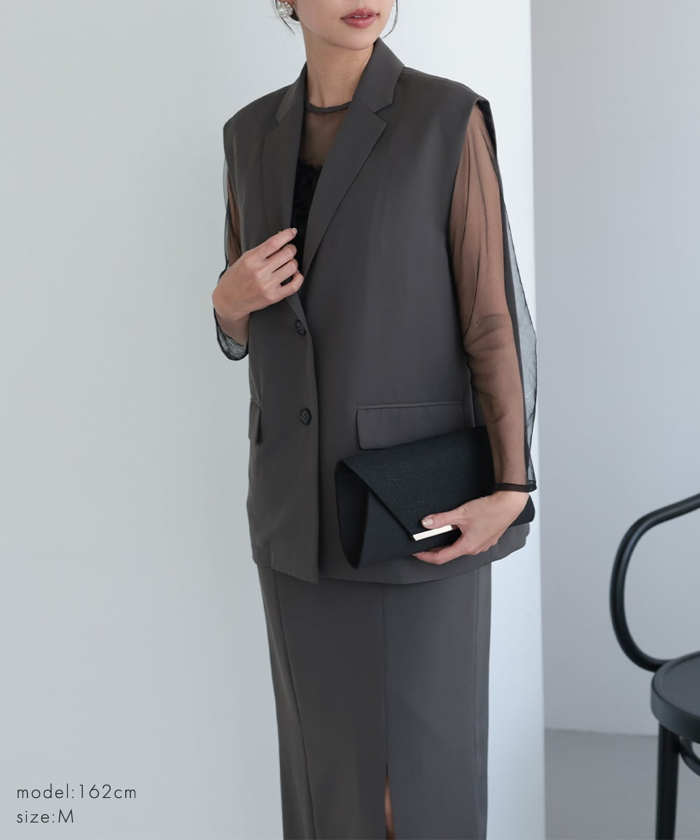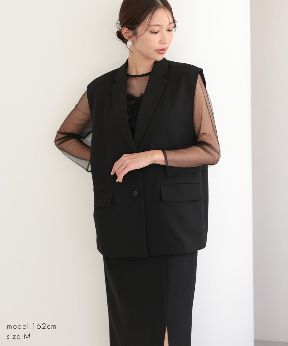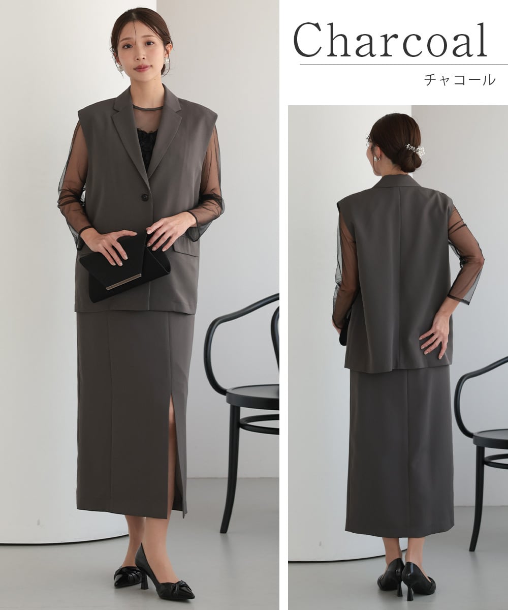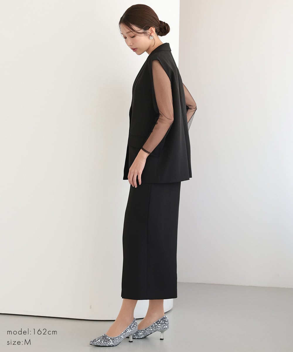 結婚式 ドレス パーティードレス ワンピース ジレ 2点セット オケージョンドレス 重ね着 レディース 秋 オケージョン 個性的 フリル 体型隠し 結婚式ドレス お呼ばれ 袖あり 長袖 ロング シアー S M 黒 チャコール 325279 | AUNI_BELLES