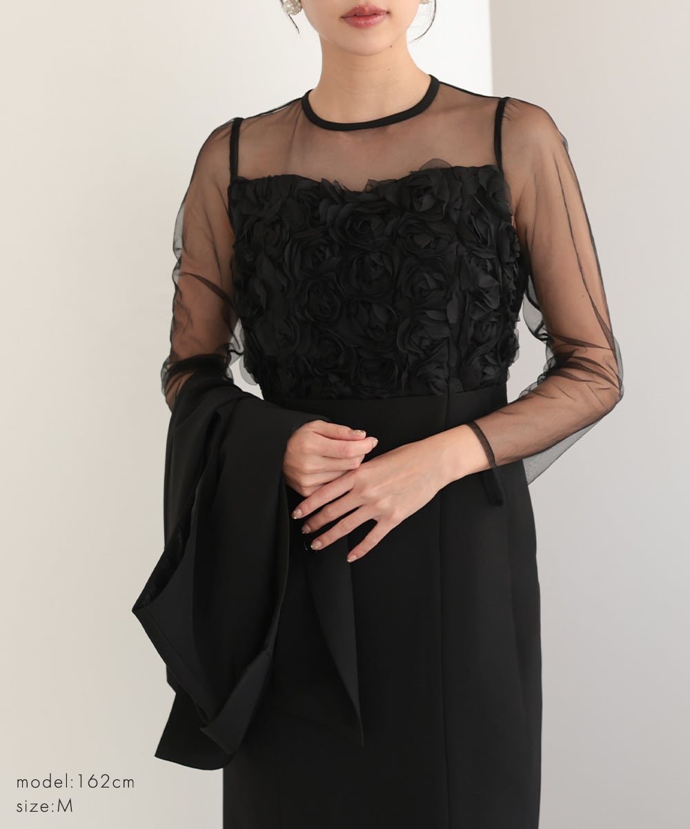 立体的なブラックローズが咲き誇る胸元に、