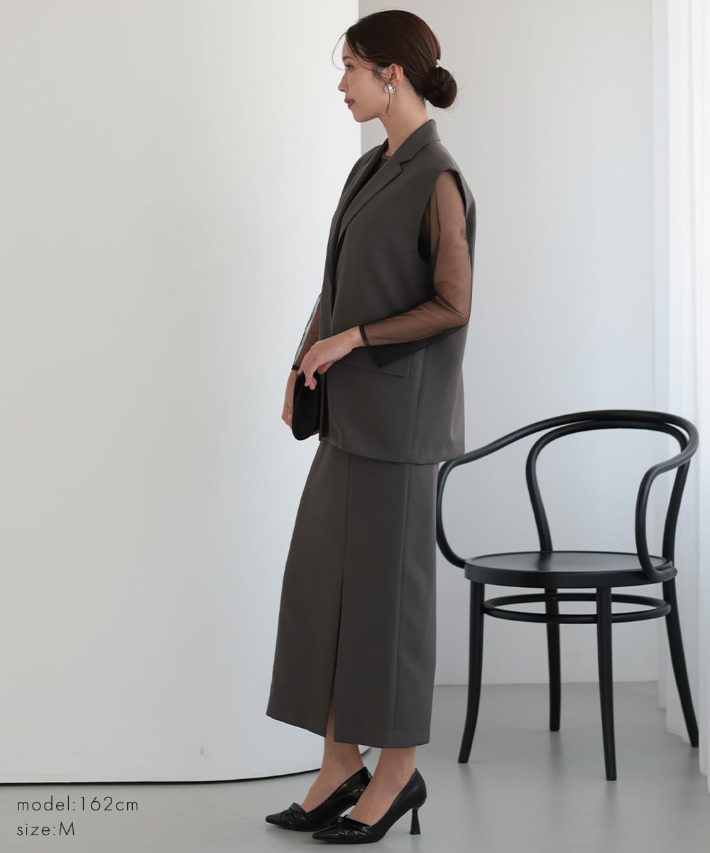 Iラインのスリット入りタイトスカートが織りなす、洗練されたモダンなシルエット。
