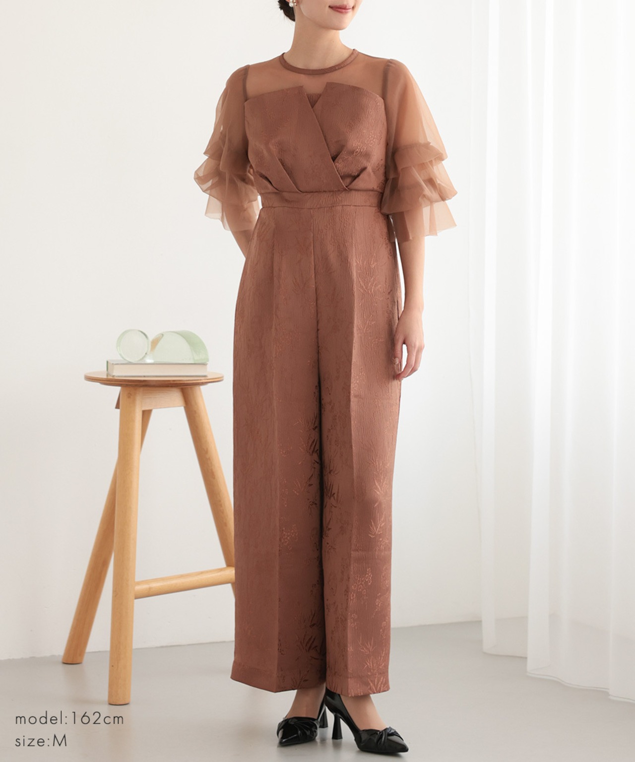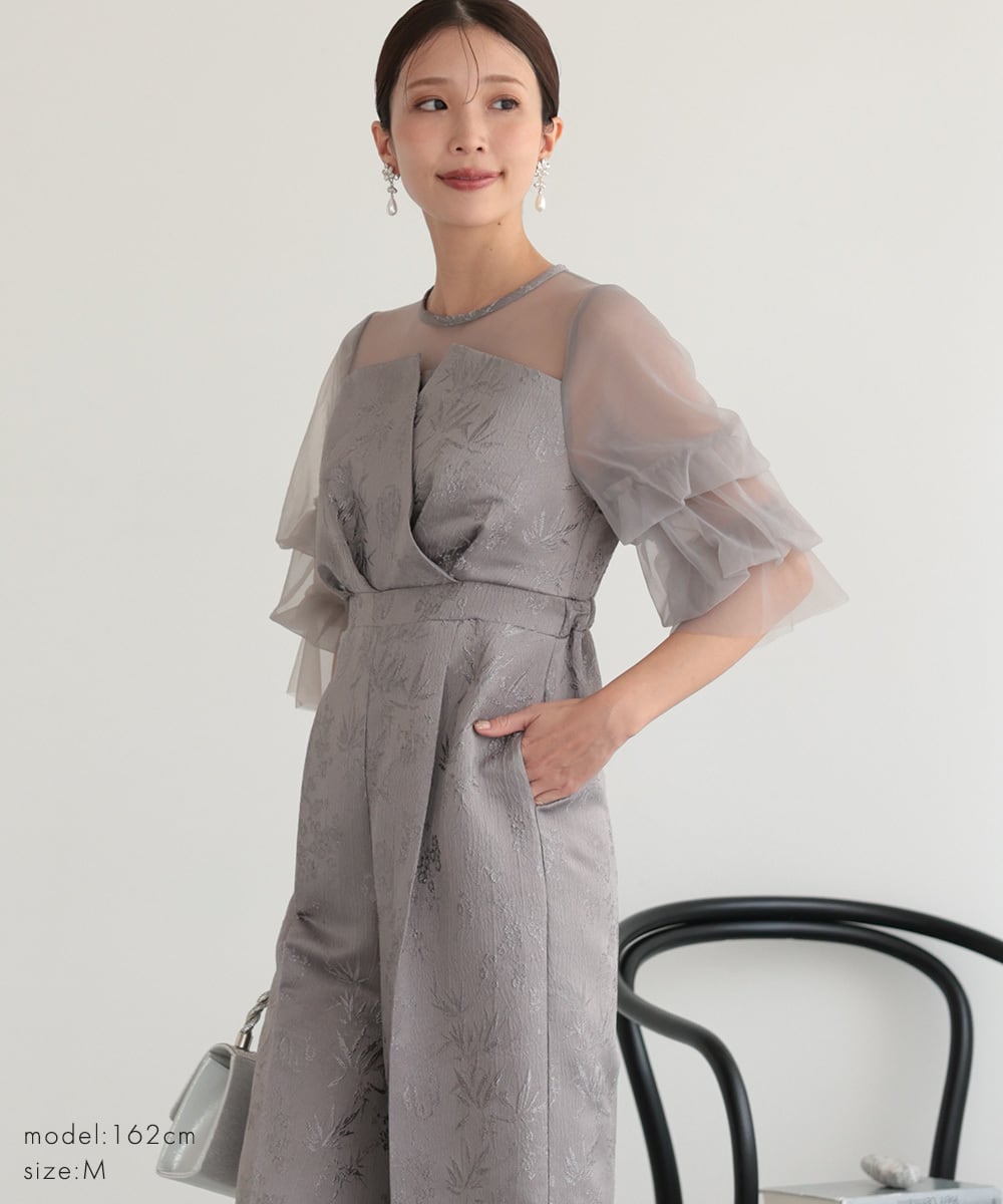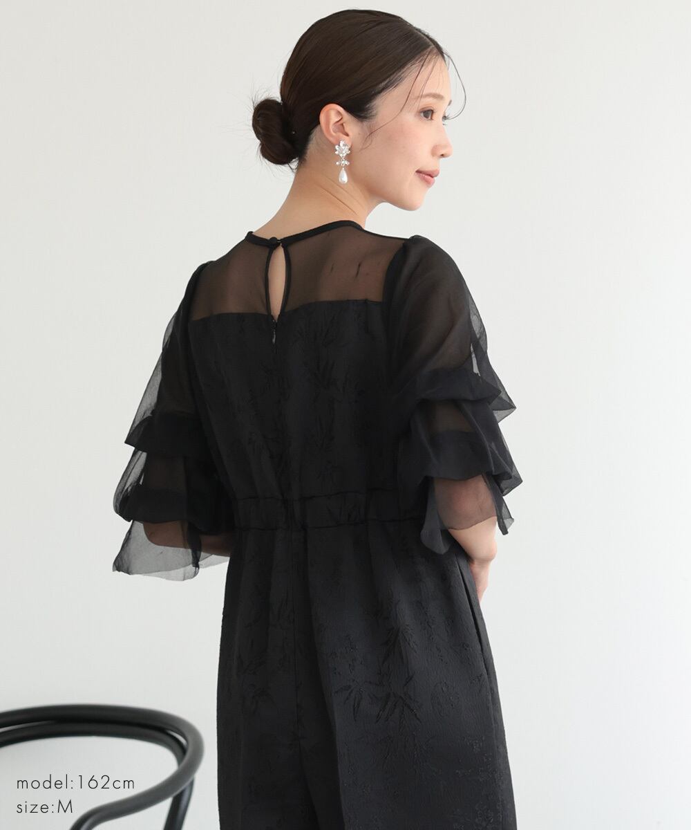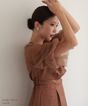 軽やかなシアー素材を使用したボリュームスリーブが、二の腕を優雅にカバー。