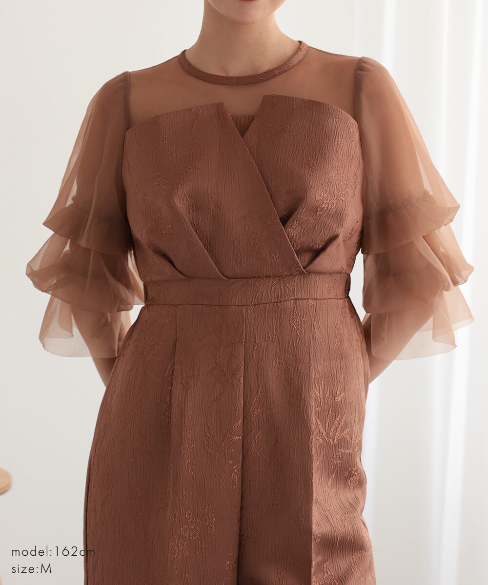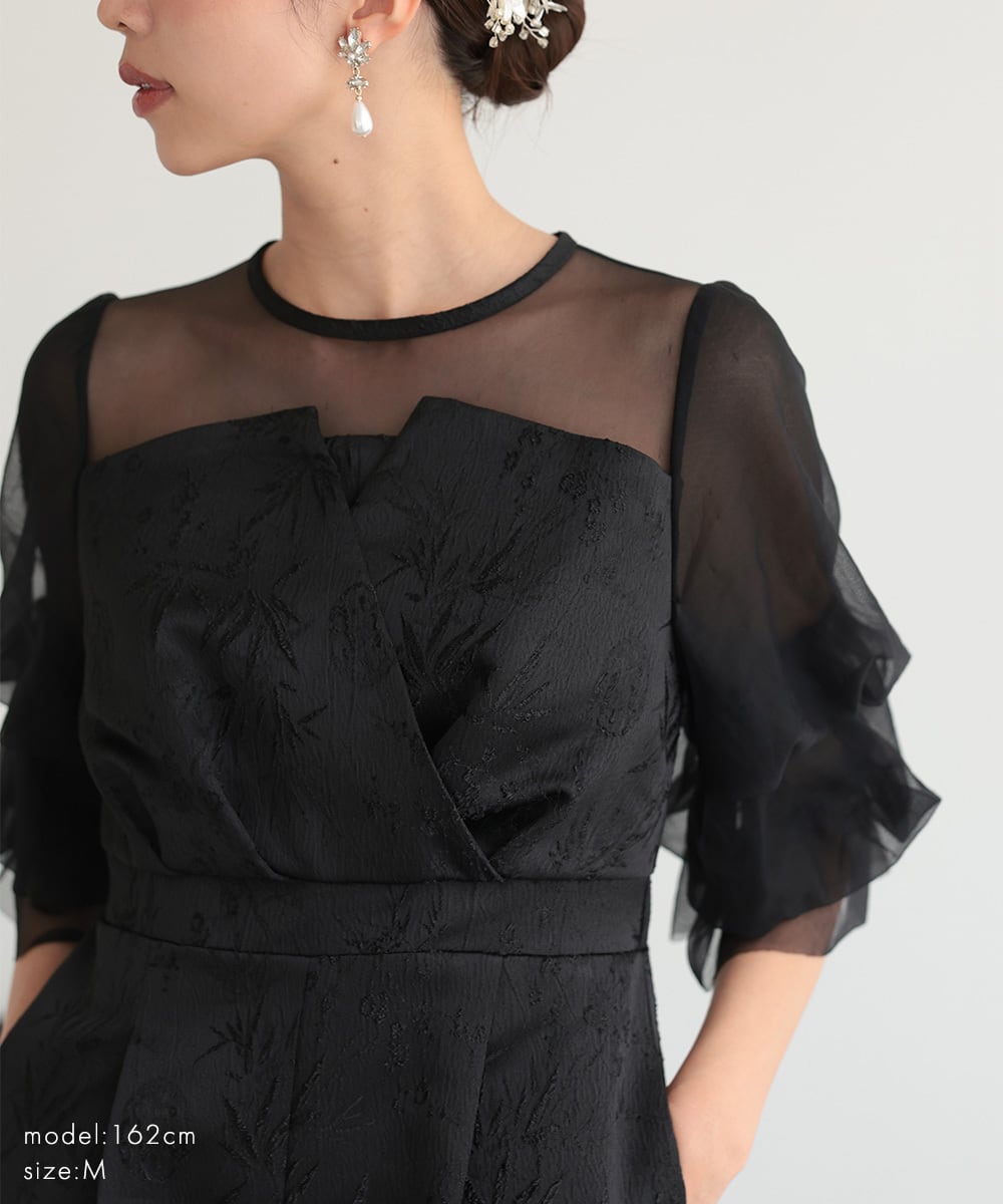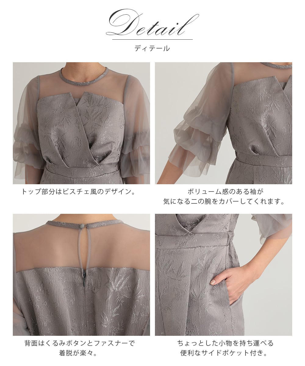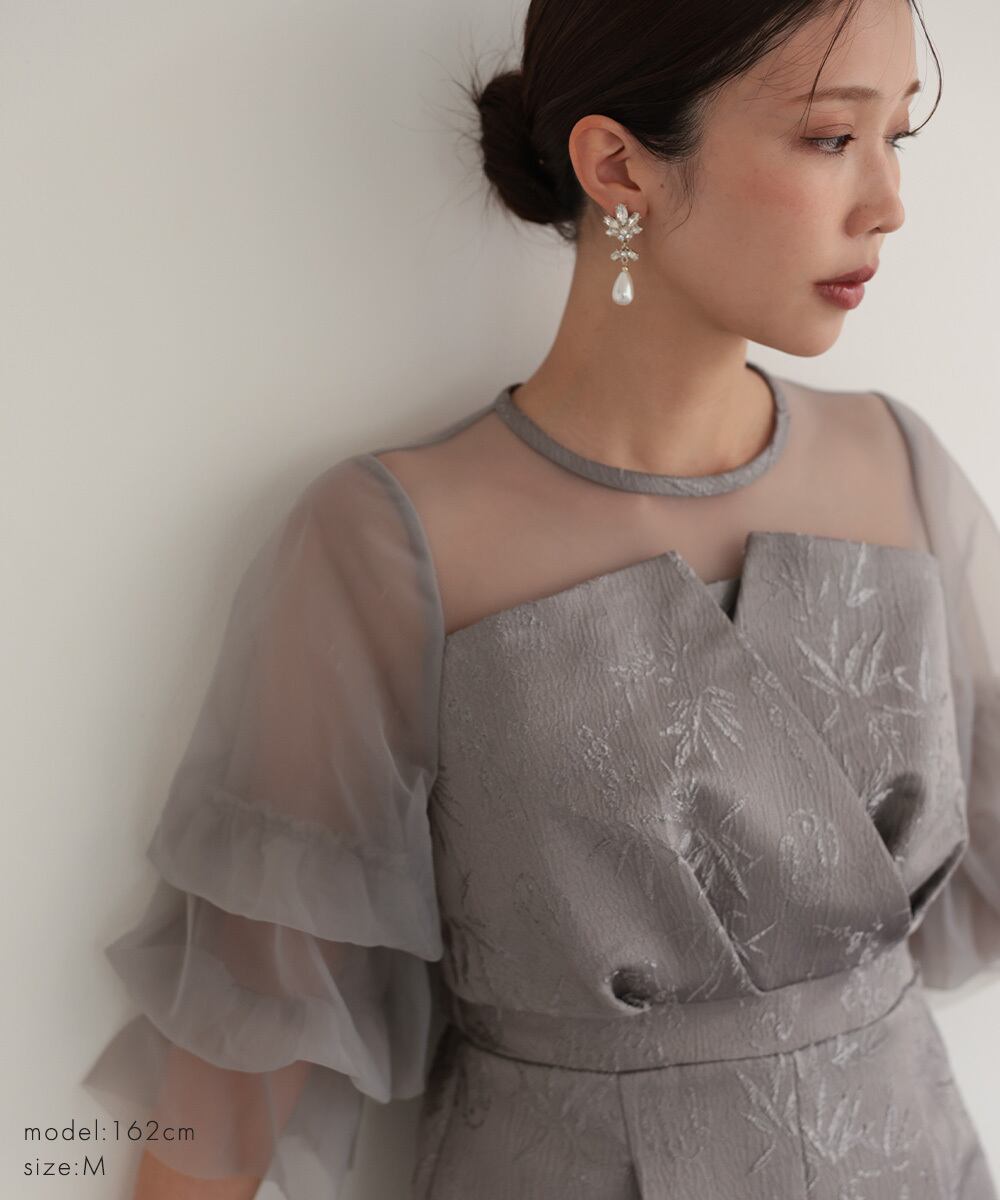 デコルテの透け感と相まって、重くならず華やかな印象を与えます。
