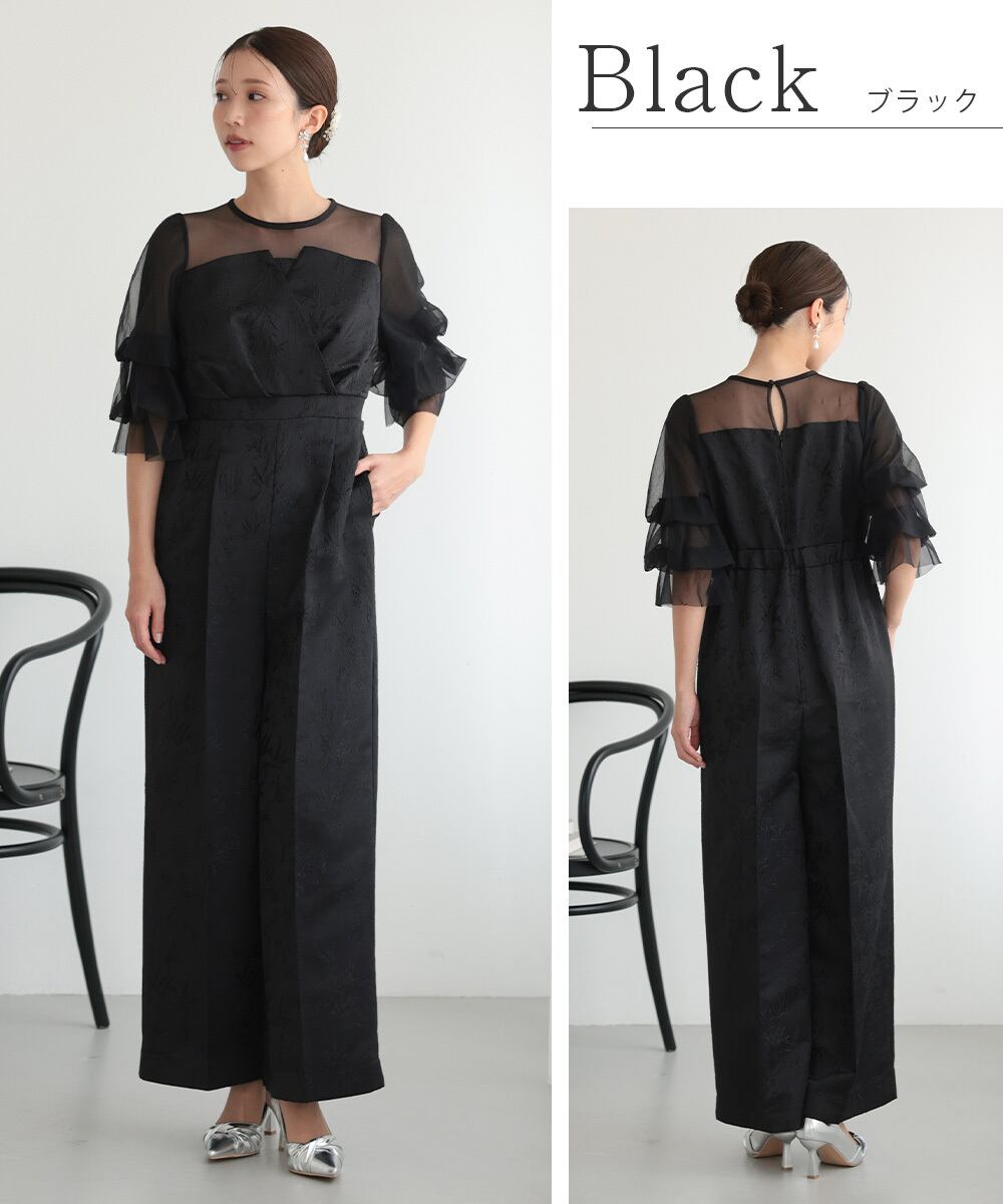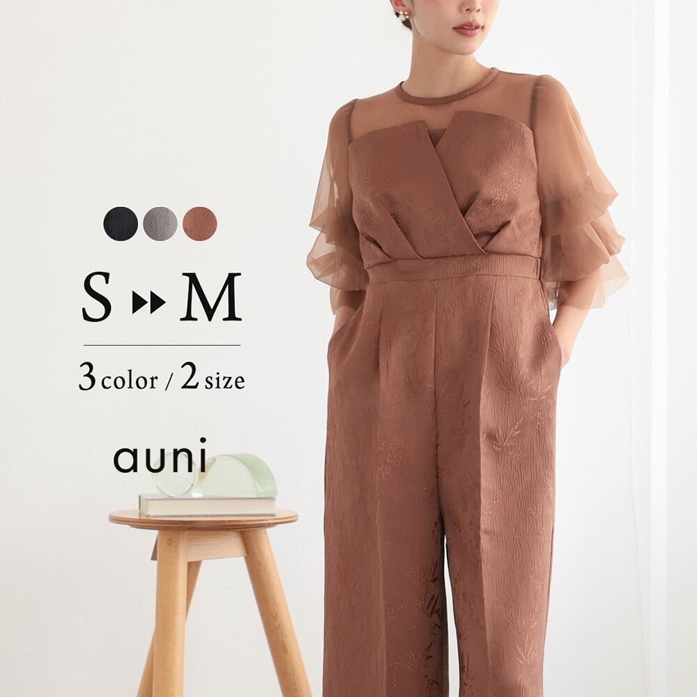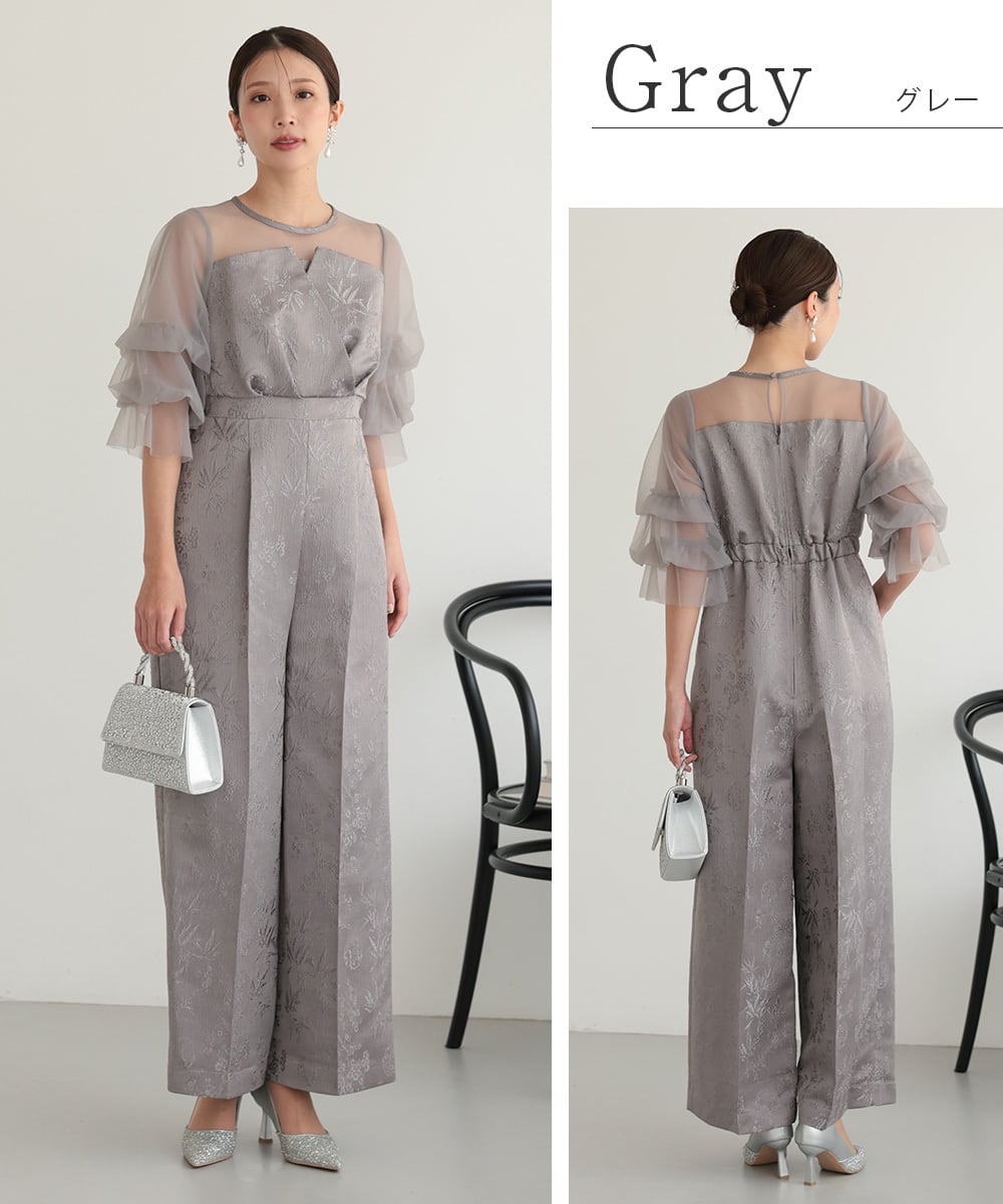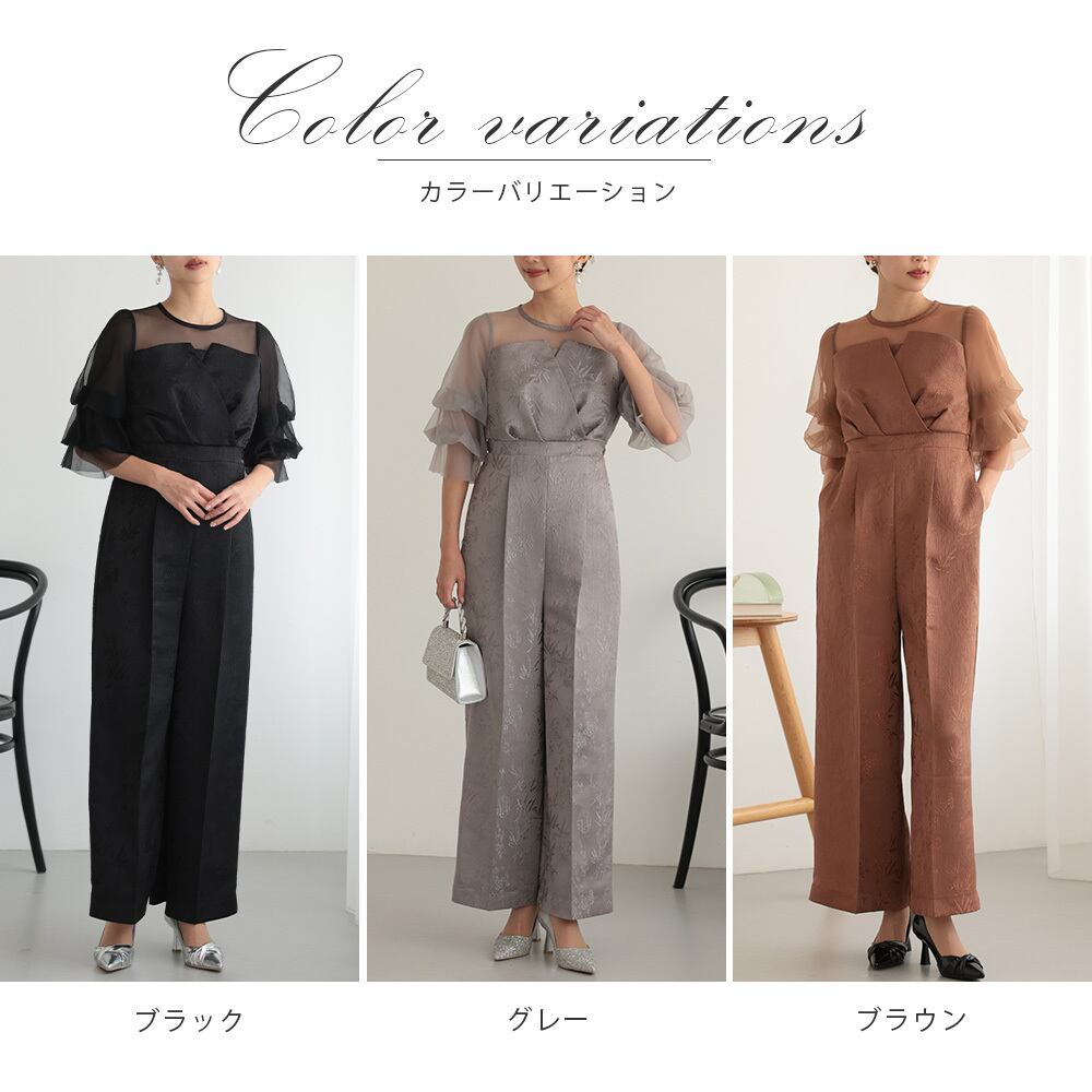 結婚式 ドレス パーティードレス パンツドレス オケージョンドレス レディース オケージョン オールインワン 体型カバー お呼ばれ 袖あり ロング ワイドパンツ ポケット付き ウエストゴム 黒 グレー ブラウン 325282 | AUNI_BELLES