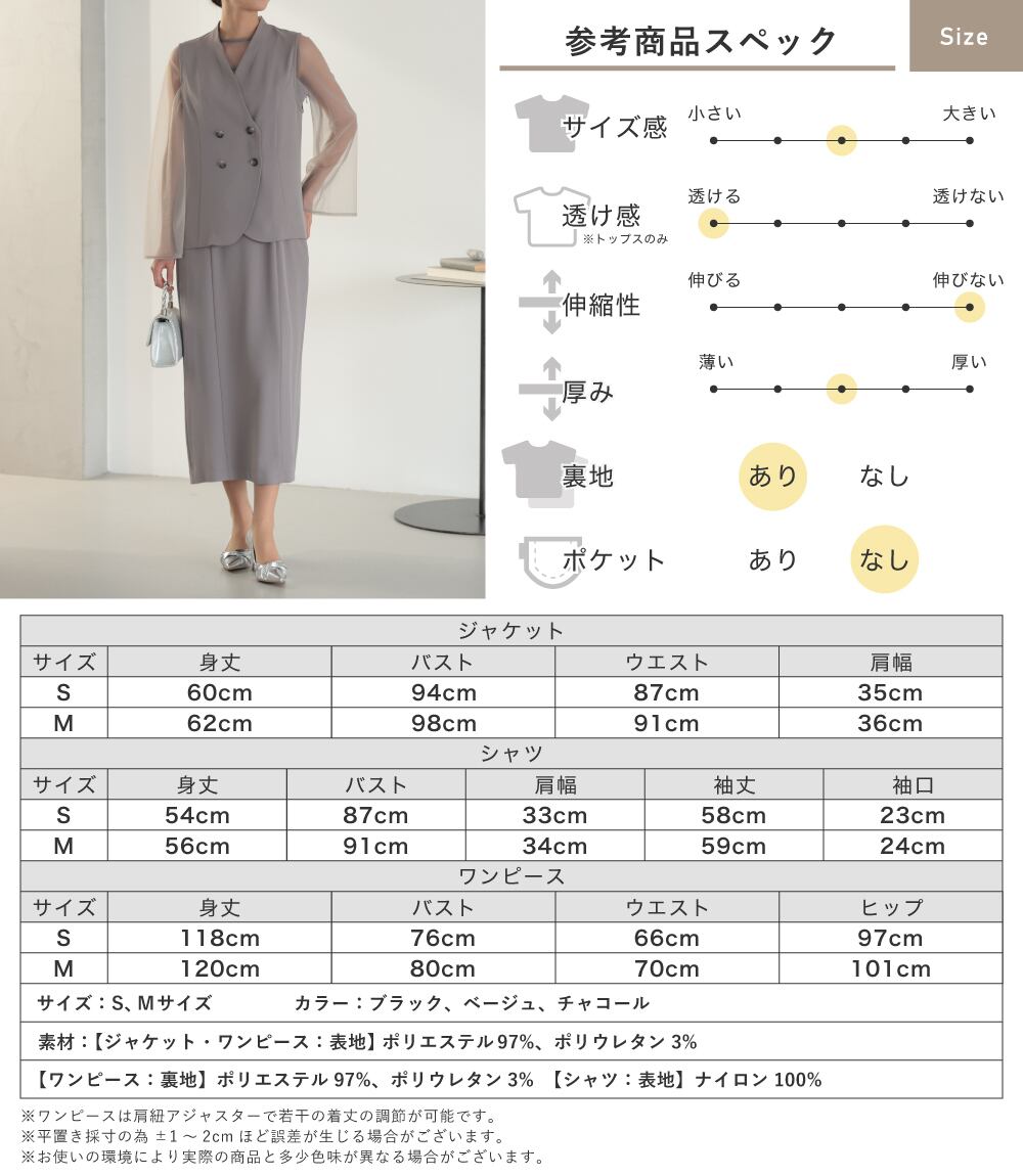 裏地(ワンピースのみ):ポリエステル97%、ポリウレタン3%