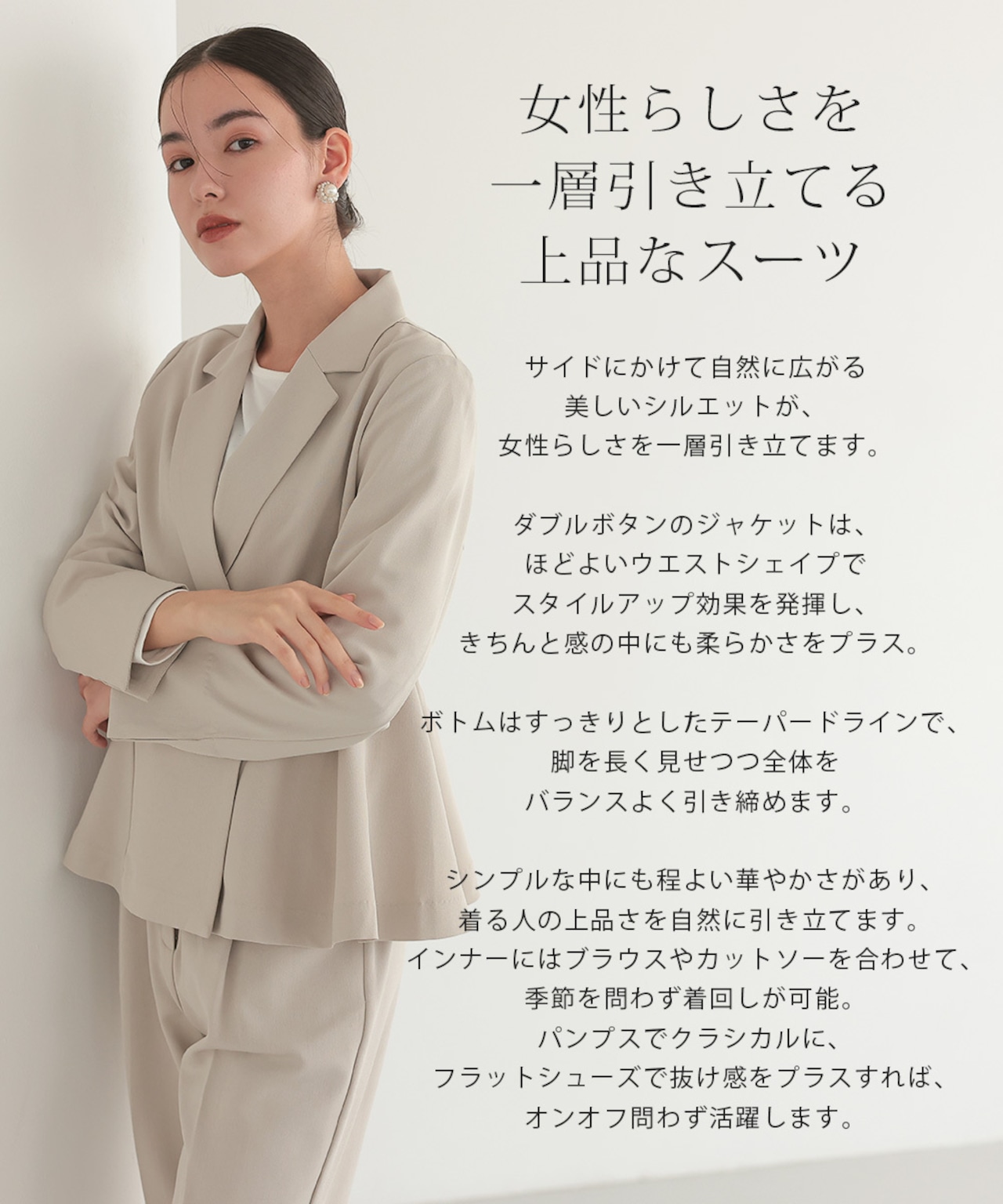 女性らしさを一層引き立てる上品なセットアップスーツ。