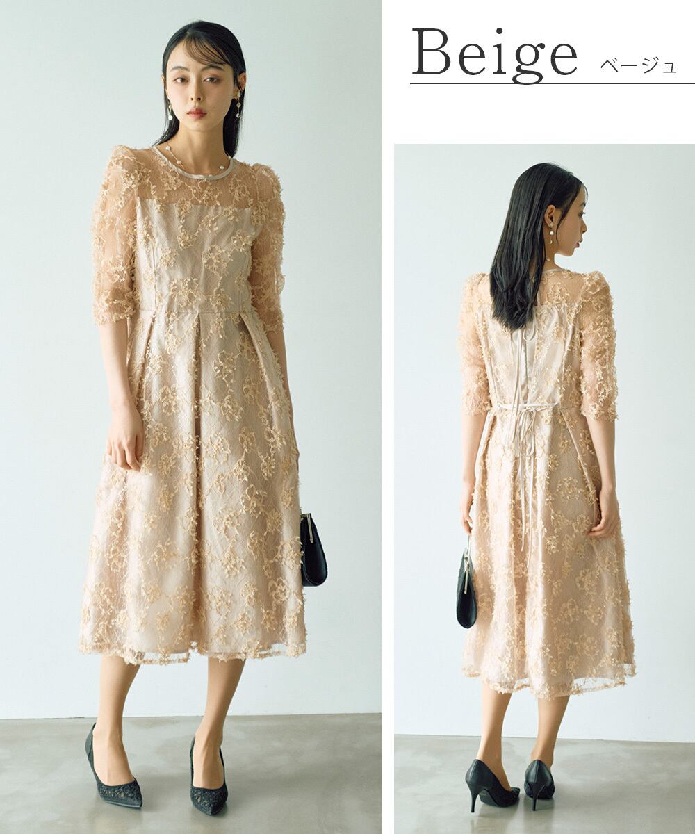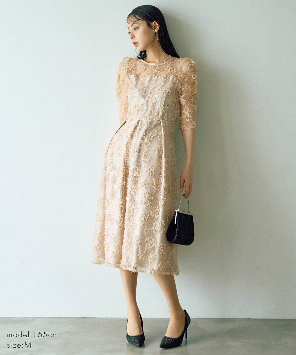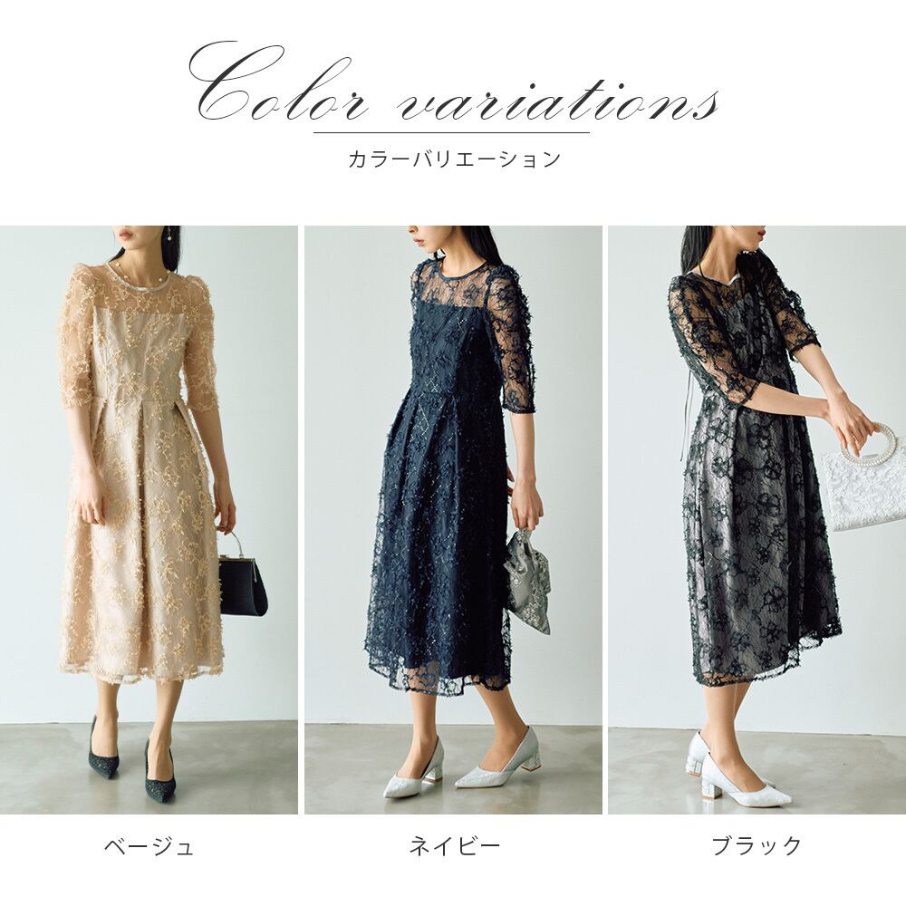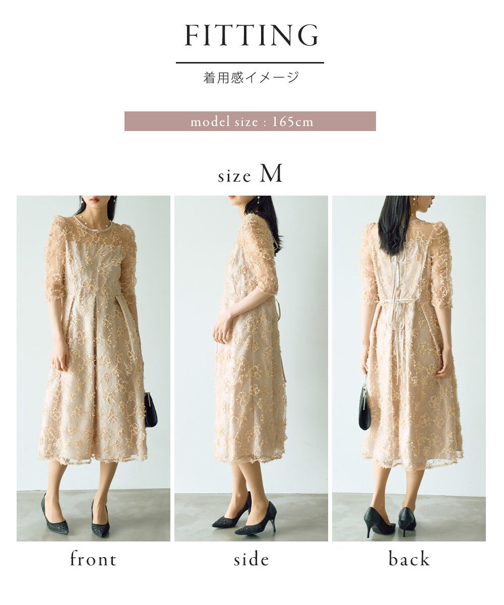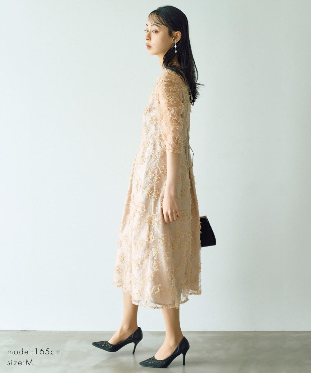 透け感のある上質な生地に立体感のある花柄刺繍が施されたこのドレスは、
