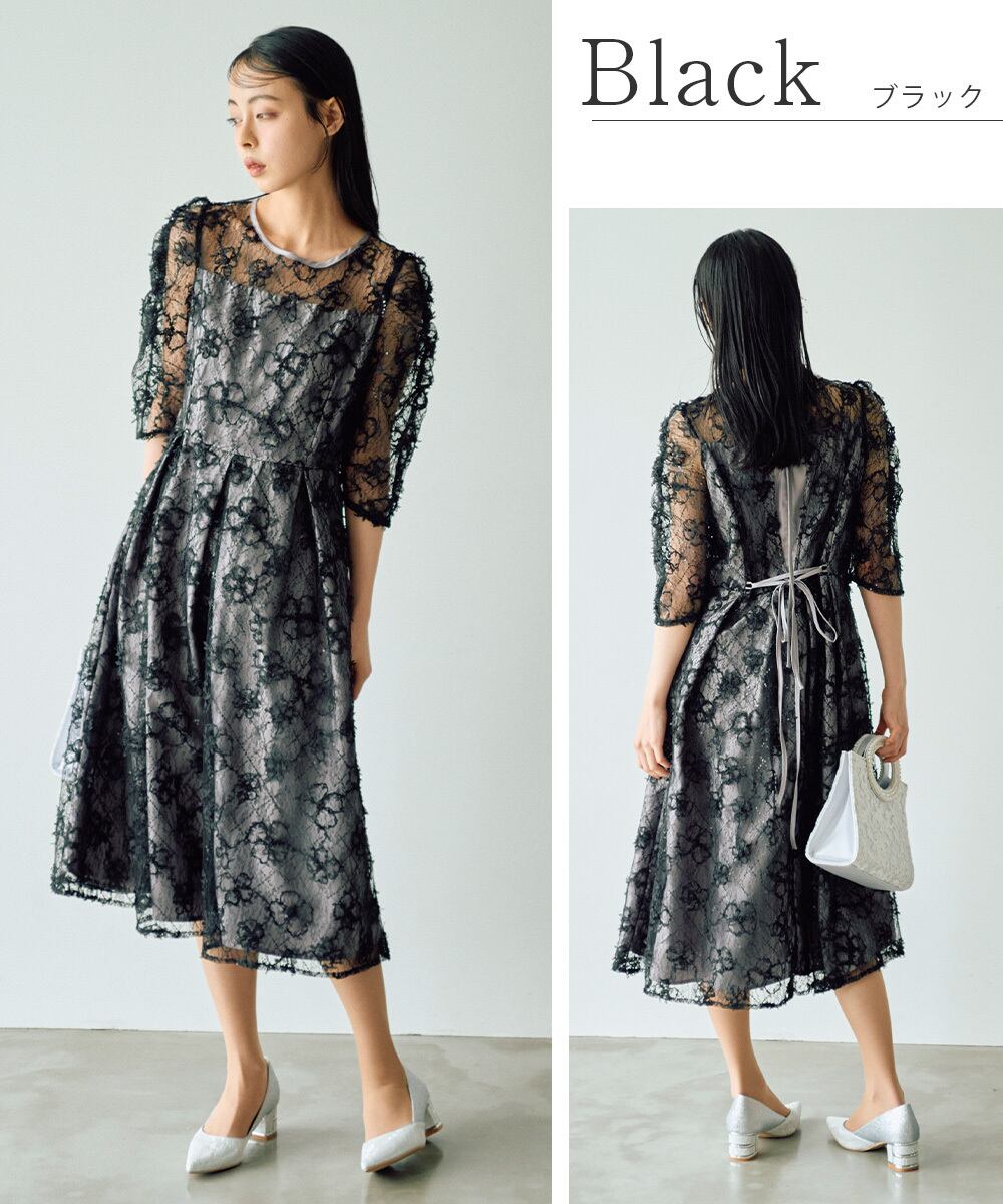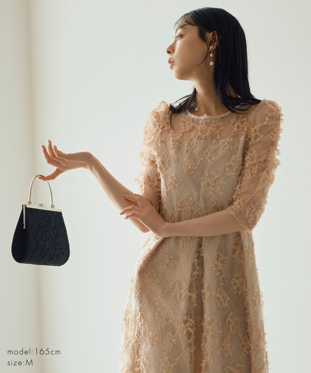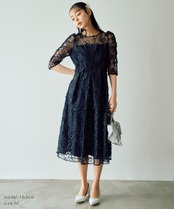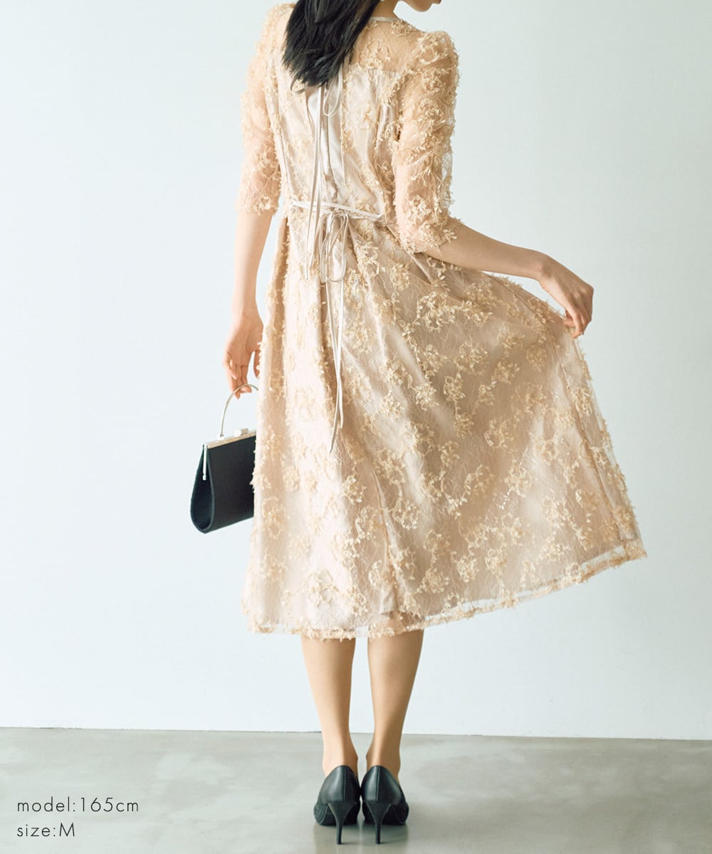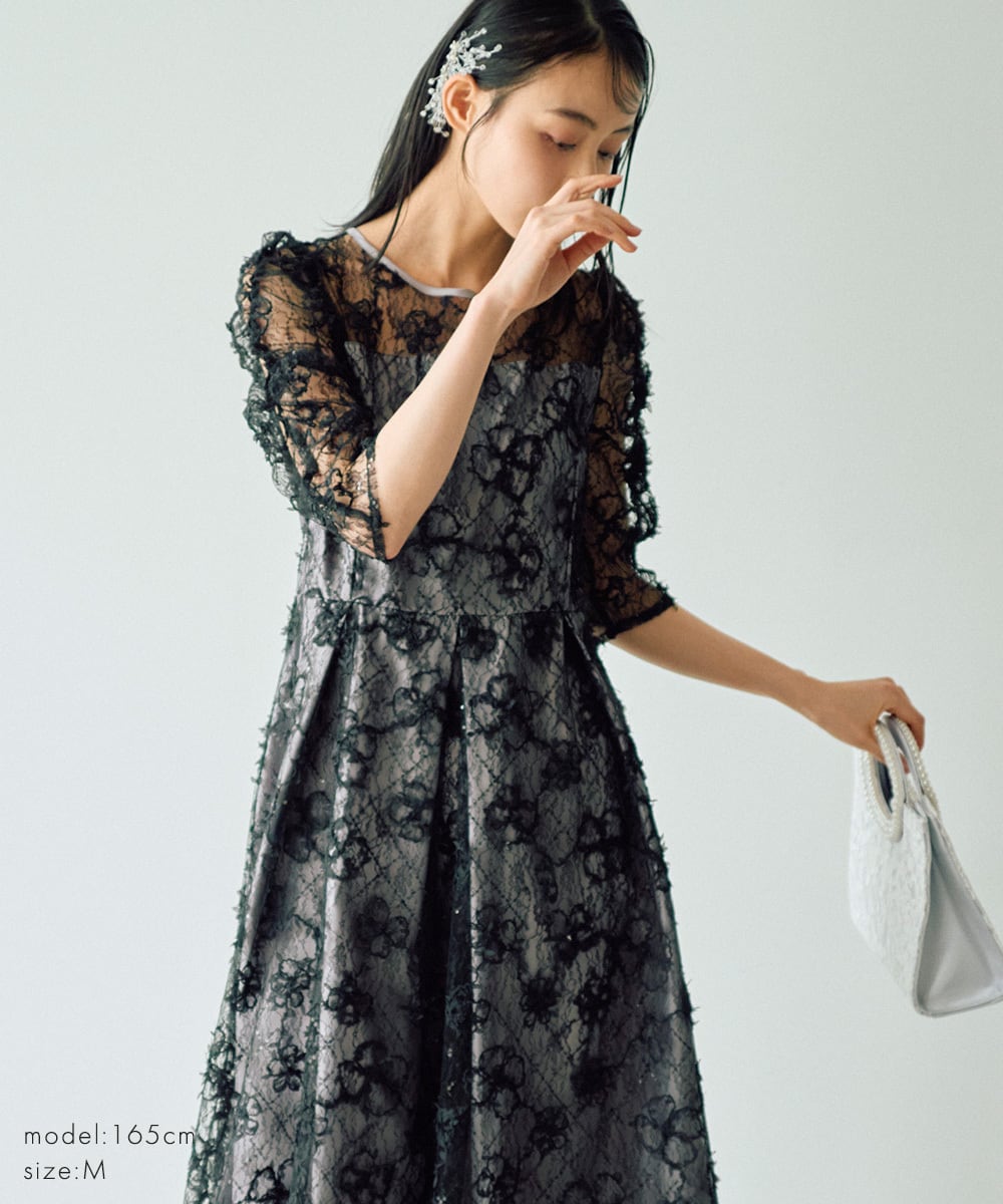 透け感のある上質な生地に立体感のある花柄刺繍が施されたこのドレスは、