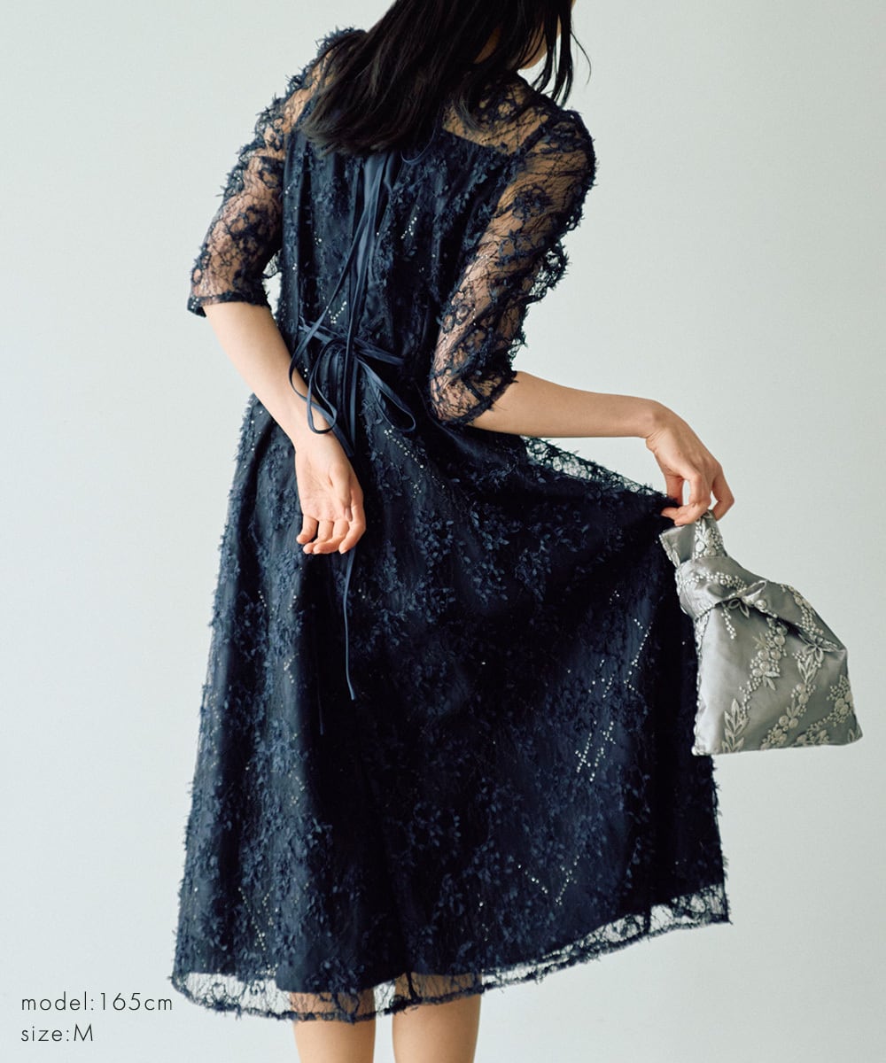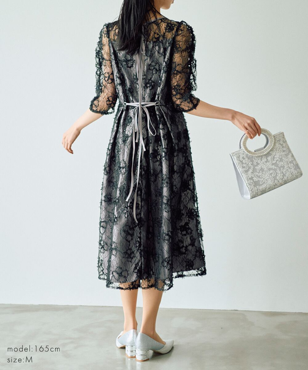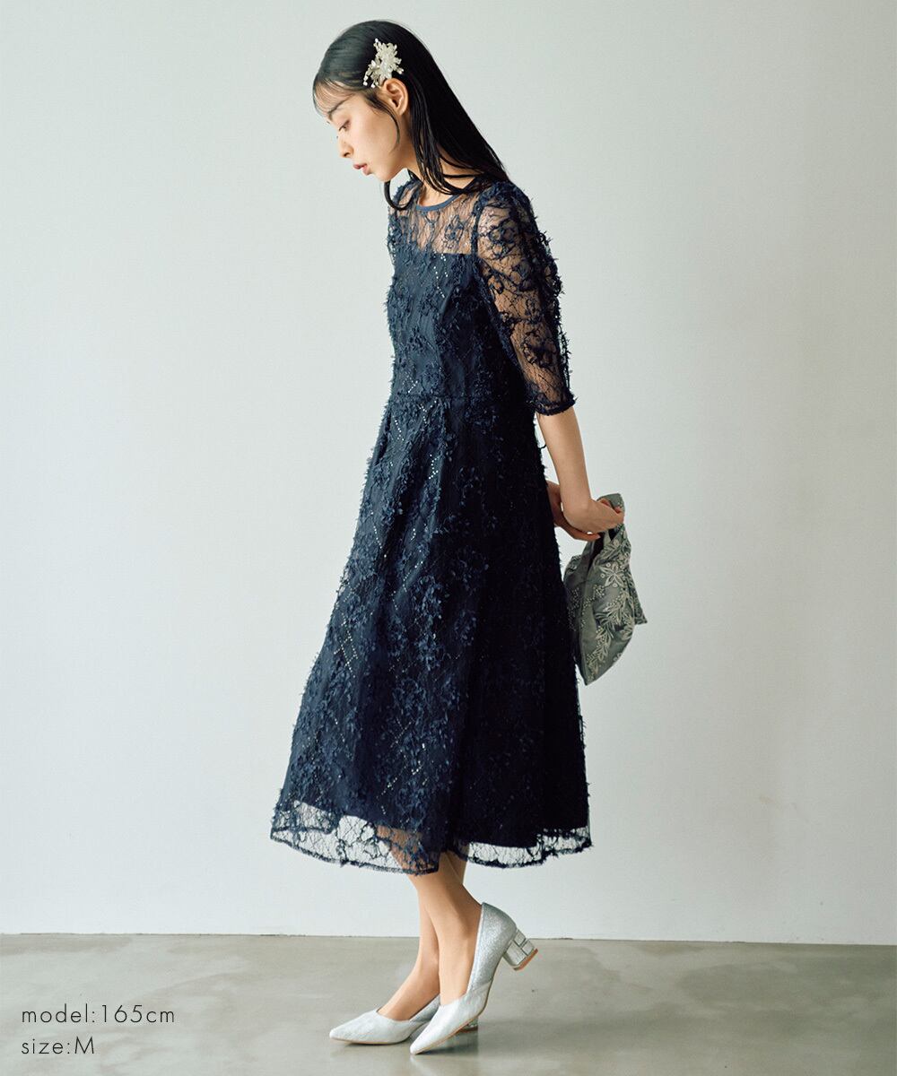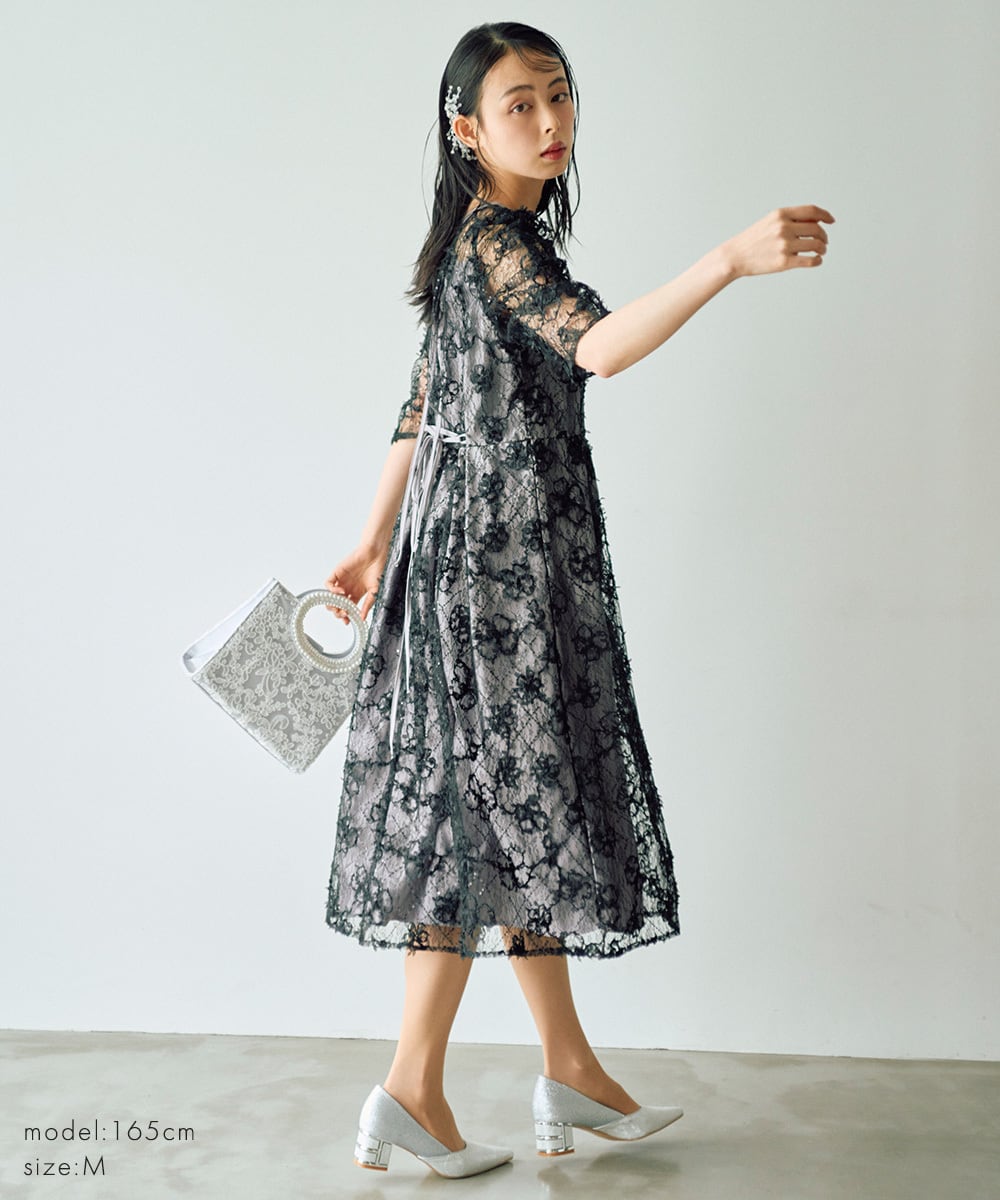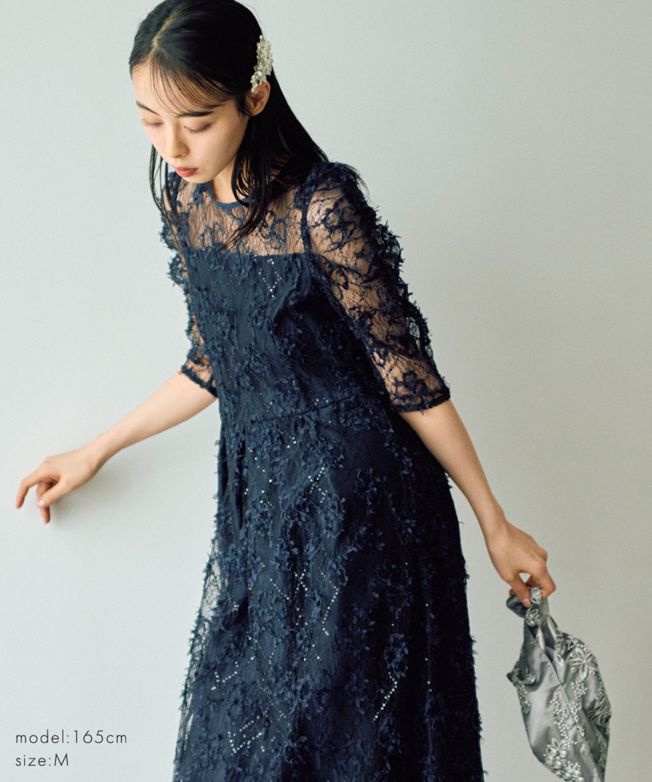 透け感のある上質な生地に立体感のある花柄刺繍が施されたこのドレスは、
