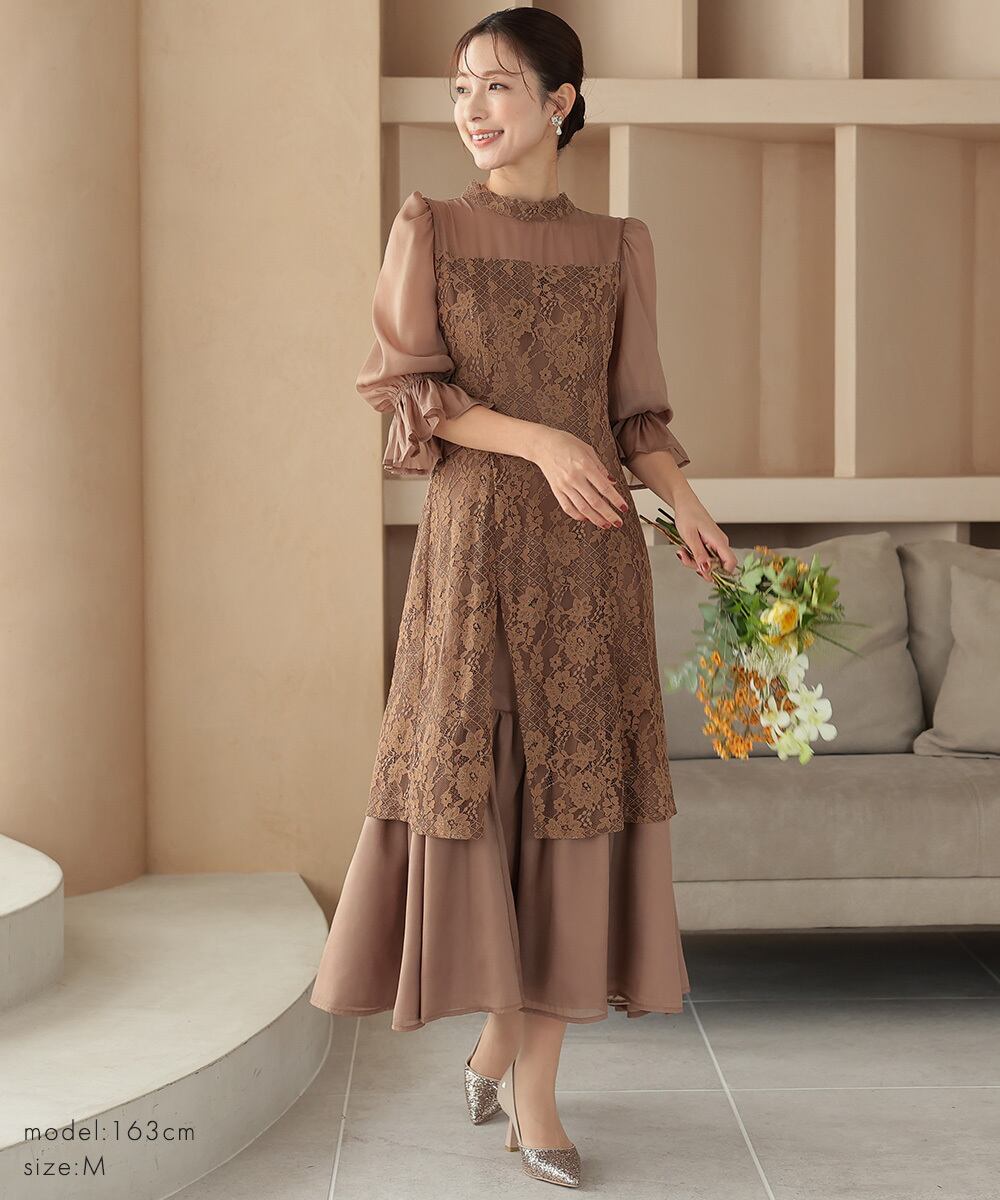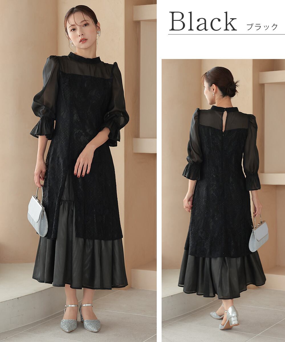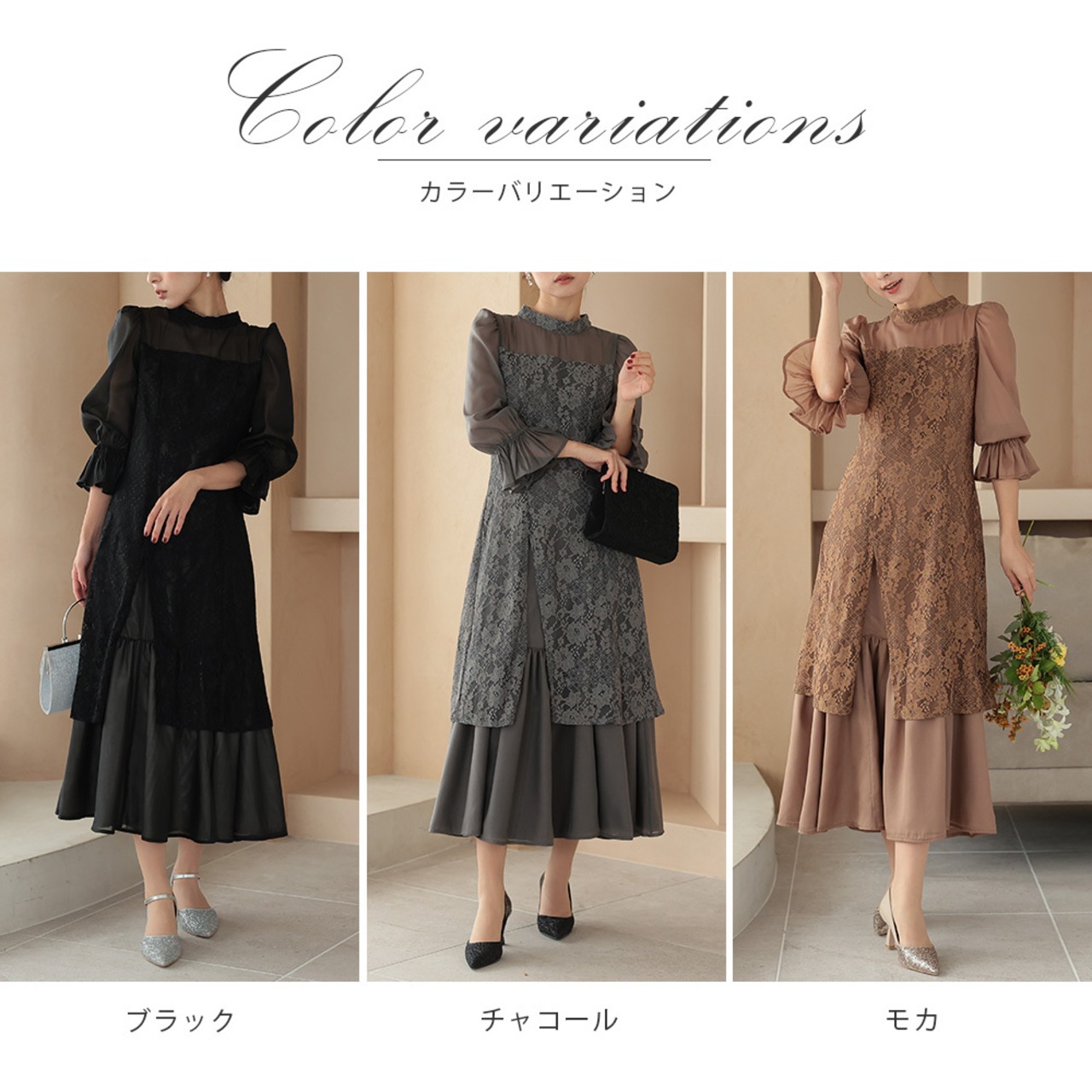 結婚式 ドレス パーティードレス オケージョンドレス ワンピース レディース 秋 オケージョン 体型隠し 結婚式ドレス お呼ばれ 長袖 七分袖 半端袖 総レース 異素材 ボトルネック 大人可愛い ロング S M 324250 | AUNI_BELLES