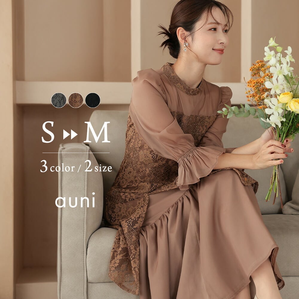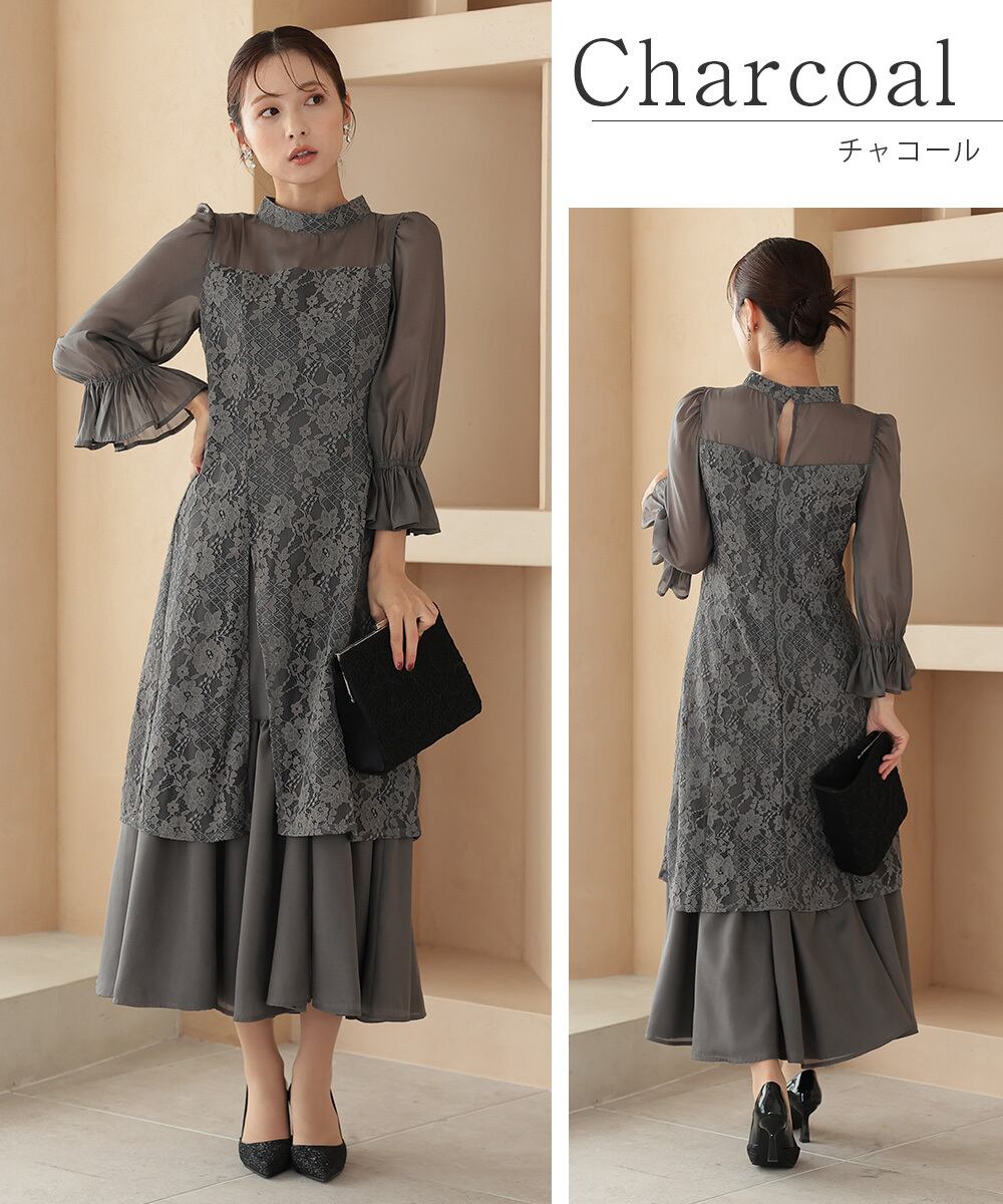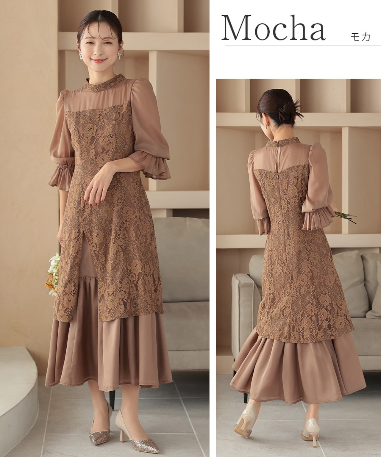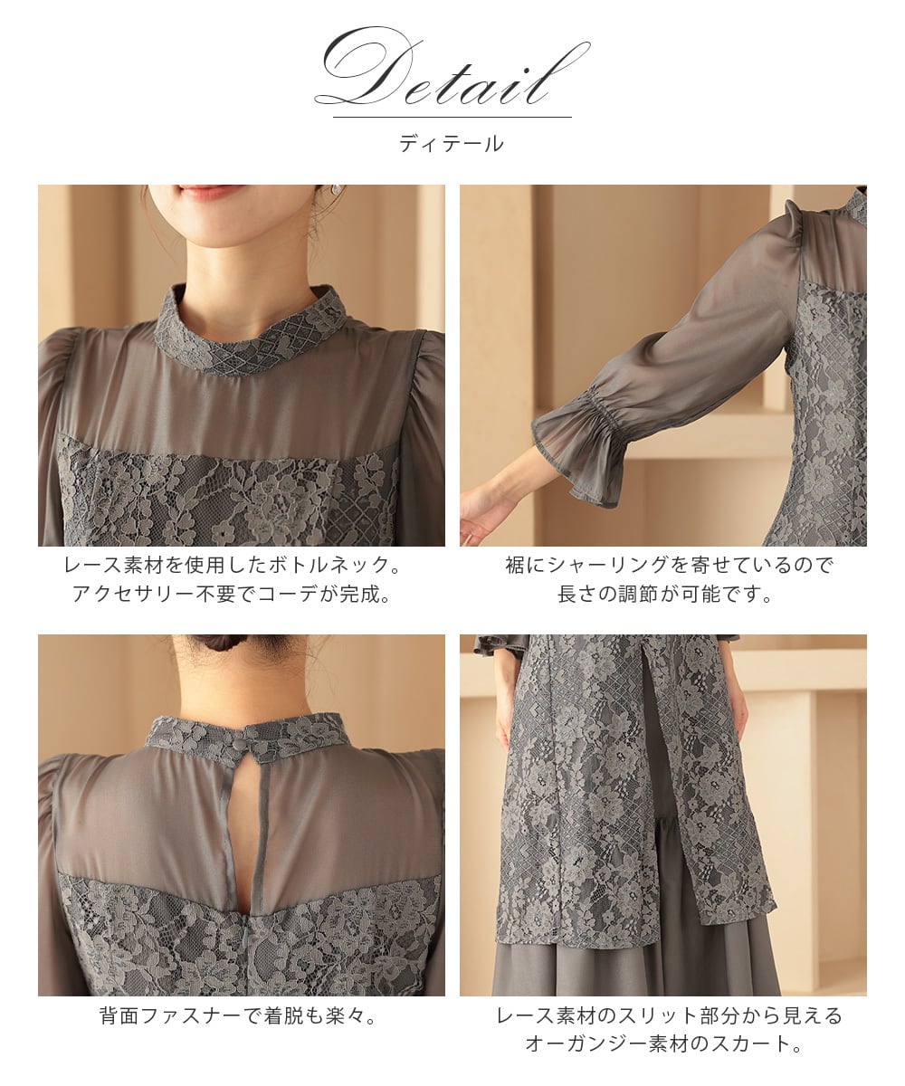 結婚式 ドレス パーティードレス オケージョンドレス ワンピース レディース 秋 オケージョン 体型隠し 結婚式ドレス お呼ばれ 長袖 七分袖 半端袖 総レース 異素材 ボトルネック 大人可愛い ロング S M 324250 | AUNI_BELLES