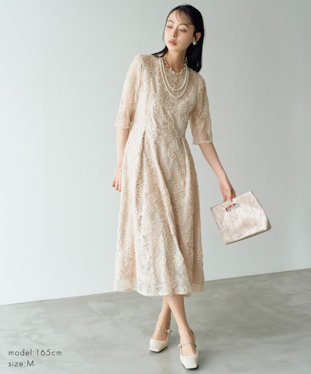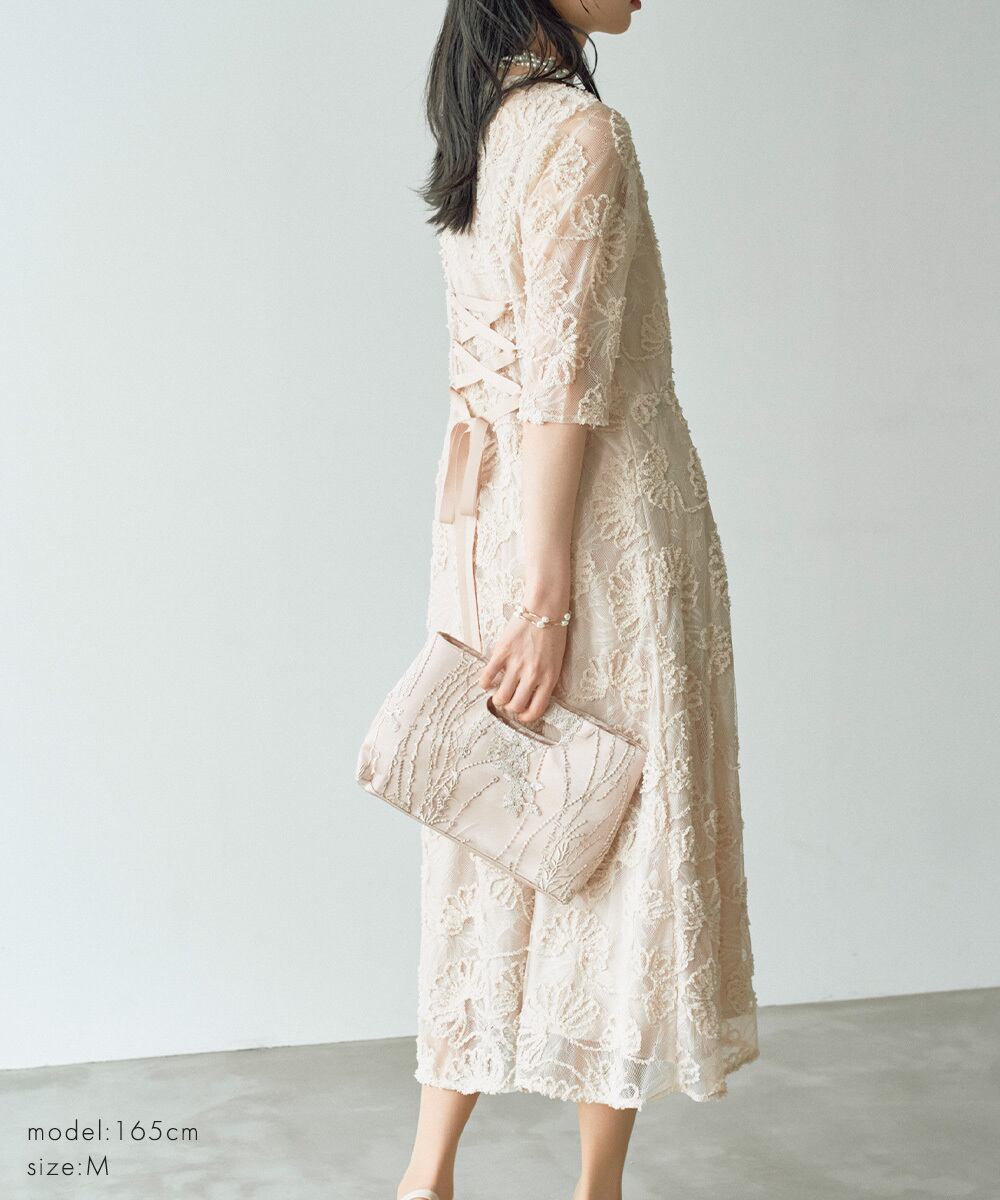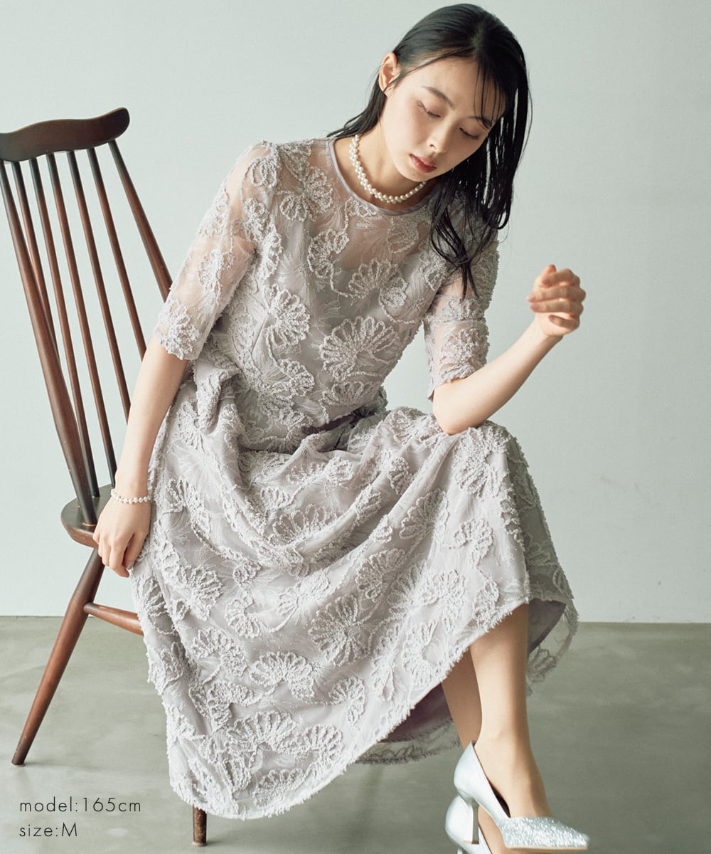 同色で繊細に刺繍された花柄は、さりげなく馴染みつつも、ドレスのアクセントとしてしっかりと主張。