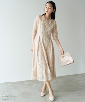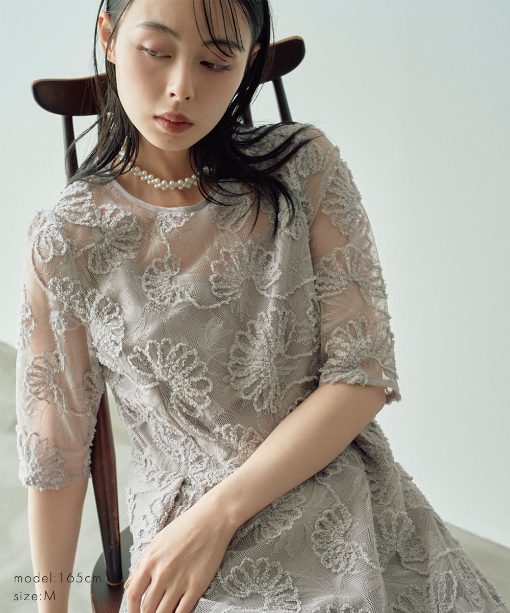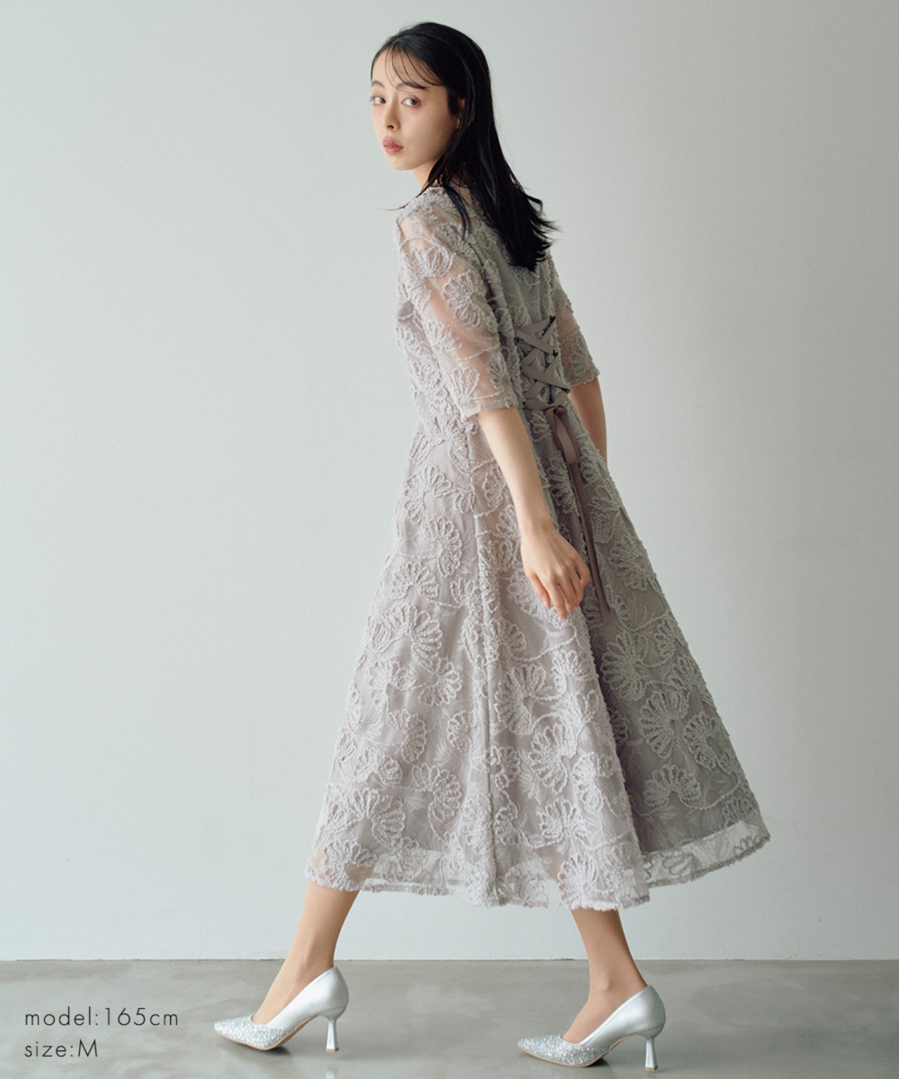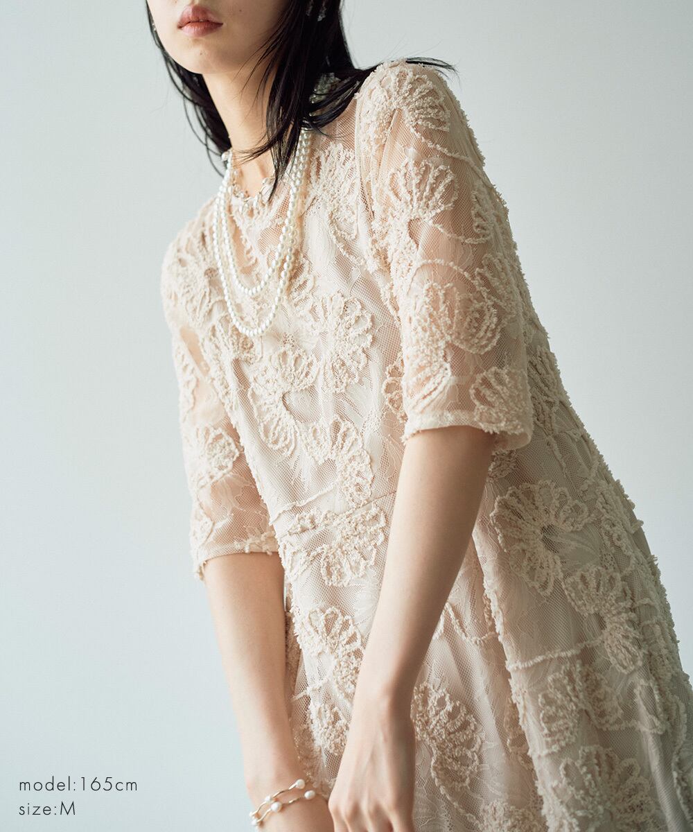 同色で繊細に刺繍された花柄は、さりげなく馴染みつつも、ドレスのアクセントとしてしっかりと主張。