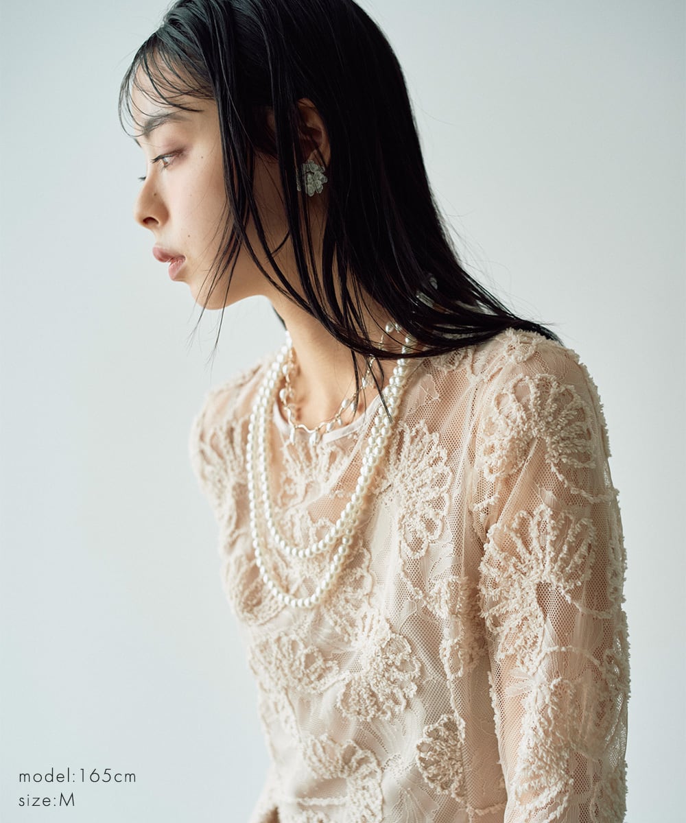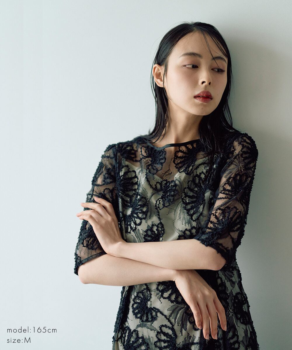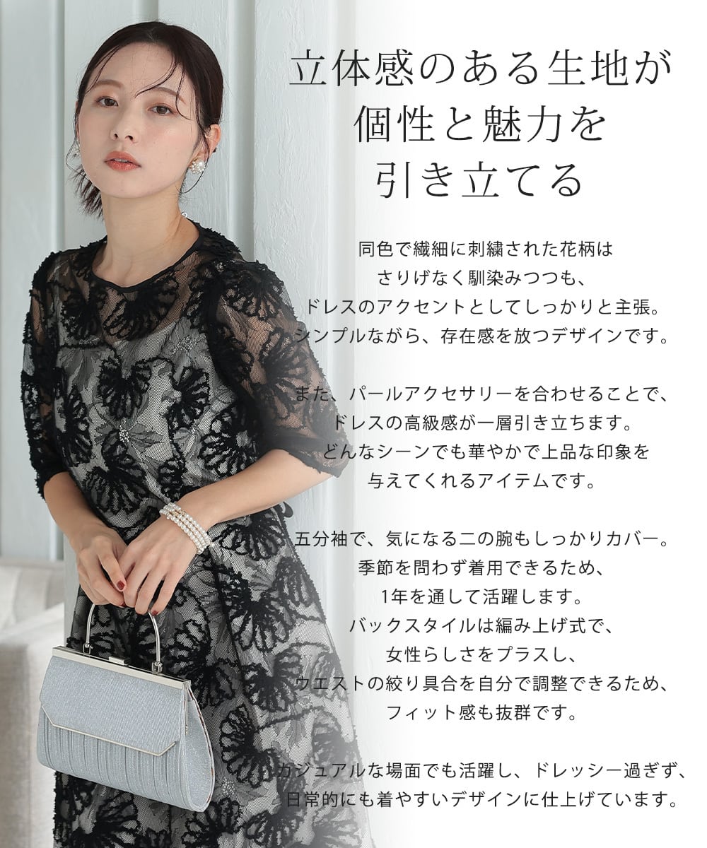 立体感のある生地に施された刺繍花柄が、他にはない個性と魅力を引き立てます。