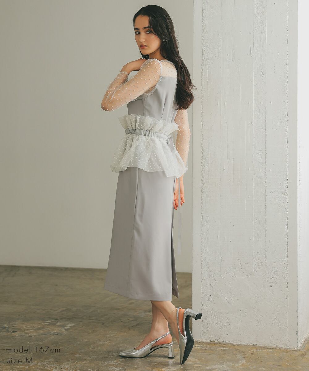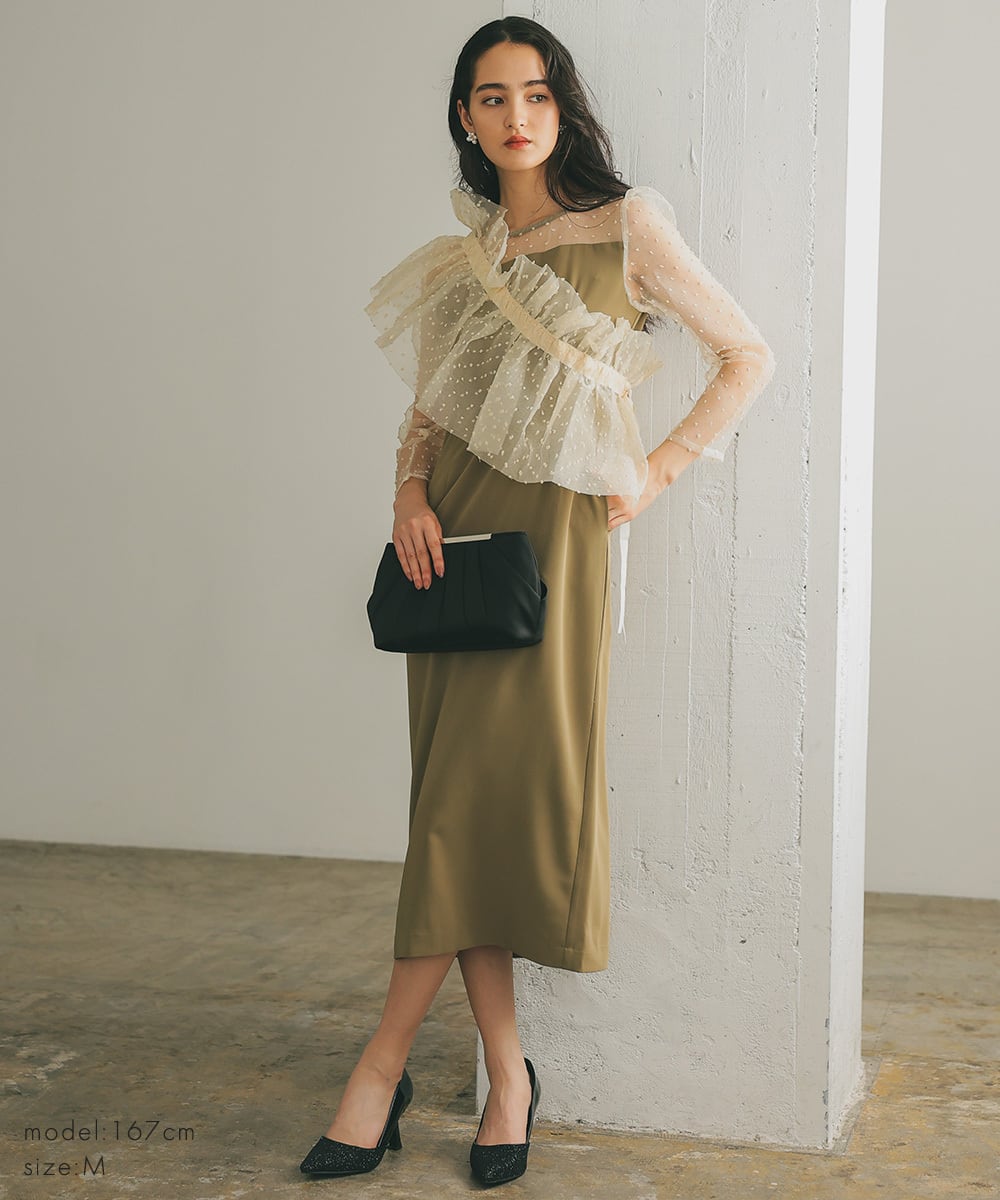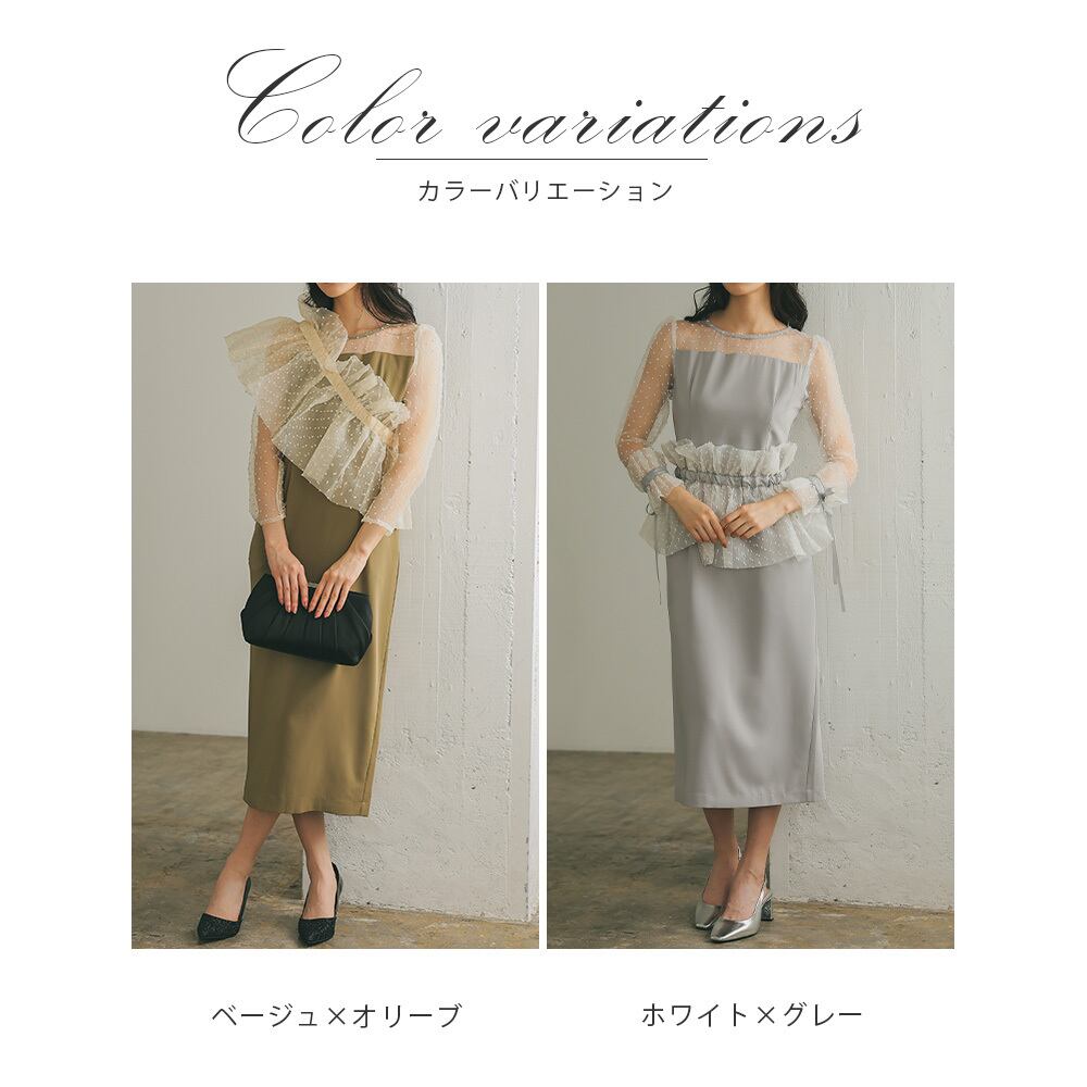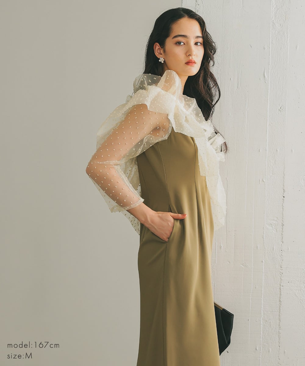 オーガンジーケープを肩掛けにしたり、ビスチェ風につけることによって、