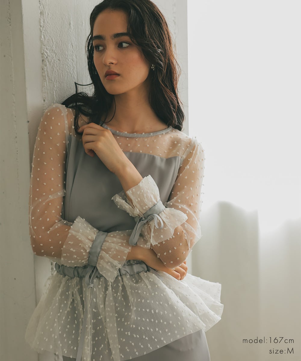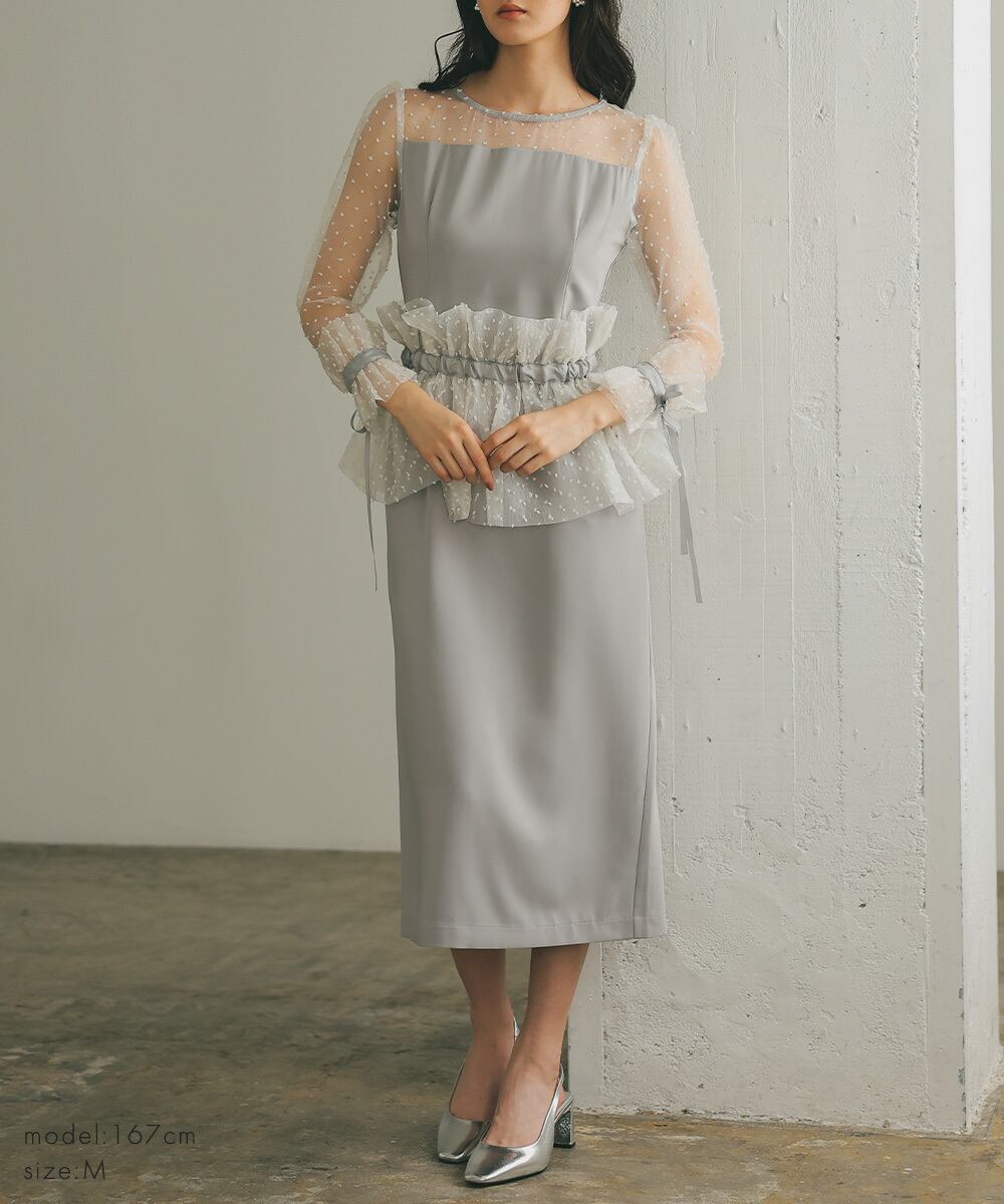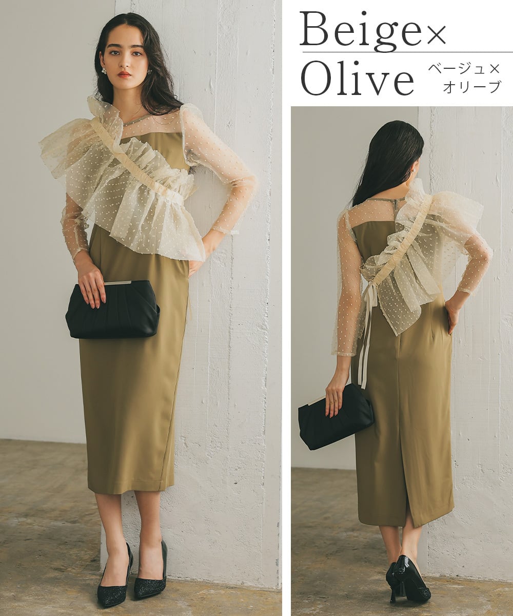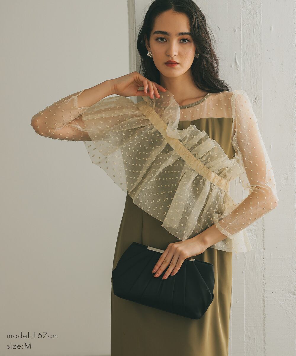 オーガンジーケープを肩掛けにしたり、ビスチェ風につけることによって、