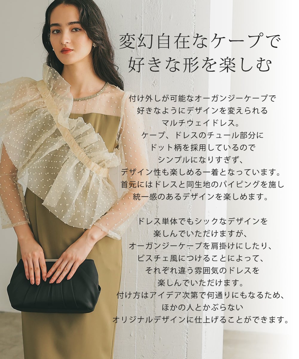 付け外しが可能なオーガンジーケープで好きなようにデザインを変えられるマルチウェイドレス。