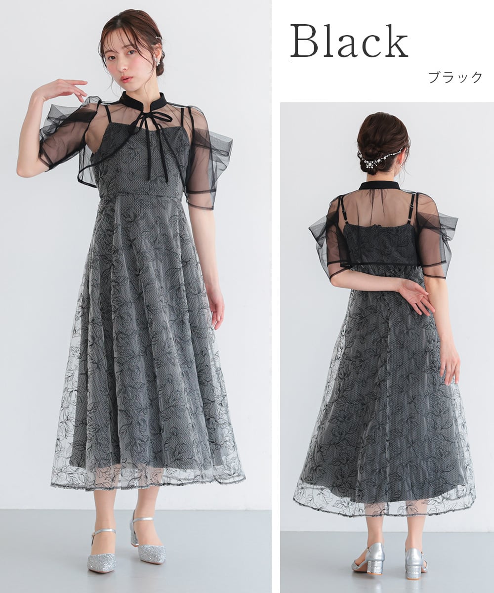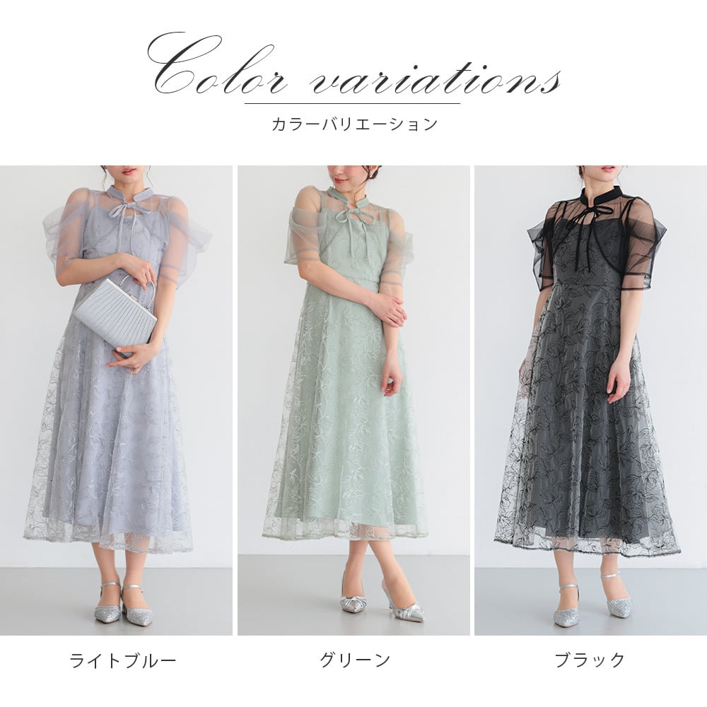 結婚式 ドレス 春 パーティードレス 2点セット ボレロ 2WAY 着回し オケージョンドレス ロング ワンピース シアー リボン オケージョン 体型カバー 結婚式ドレス お呼ばれ ロング 大人可愛い ボリューム袖 ミモレ丈 S M L 326286