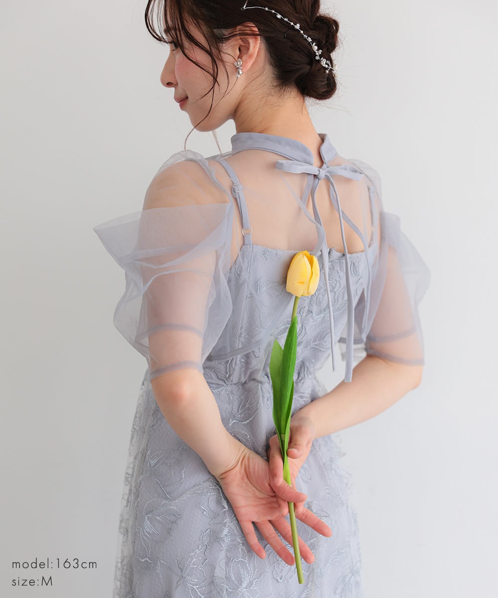 繊細な透け感のあるスリーブと、女性らしいディテールが軽やかな華やぎを演出します。