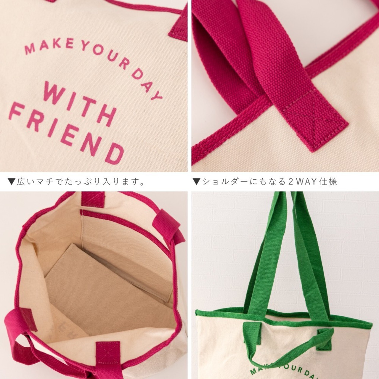 トートバッグ レディース 大容量 軽量 マザーズバッグ キャンバス 大きめ 肩掛け 手提げ 2way マチあり マチ広 ミディアム おでかけ ピンク イエロー 黄 グリーン 緑 普段使い シンプル 春 夏 秋 冬 送料無料 01220000 | AUNI_BELLES