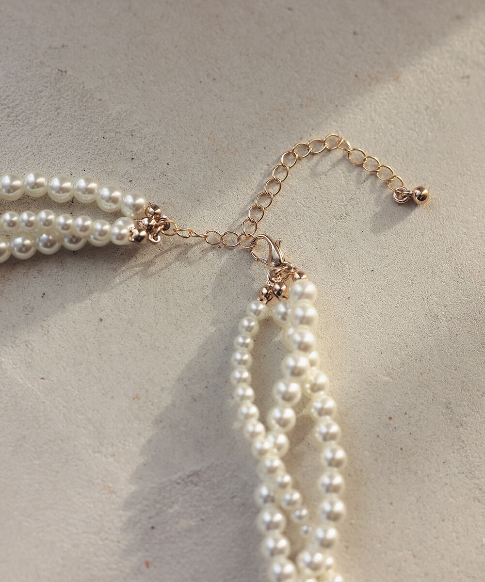 らせん状に編みこんだ3連デザインのツイストパールネックレス。