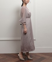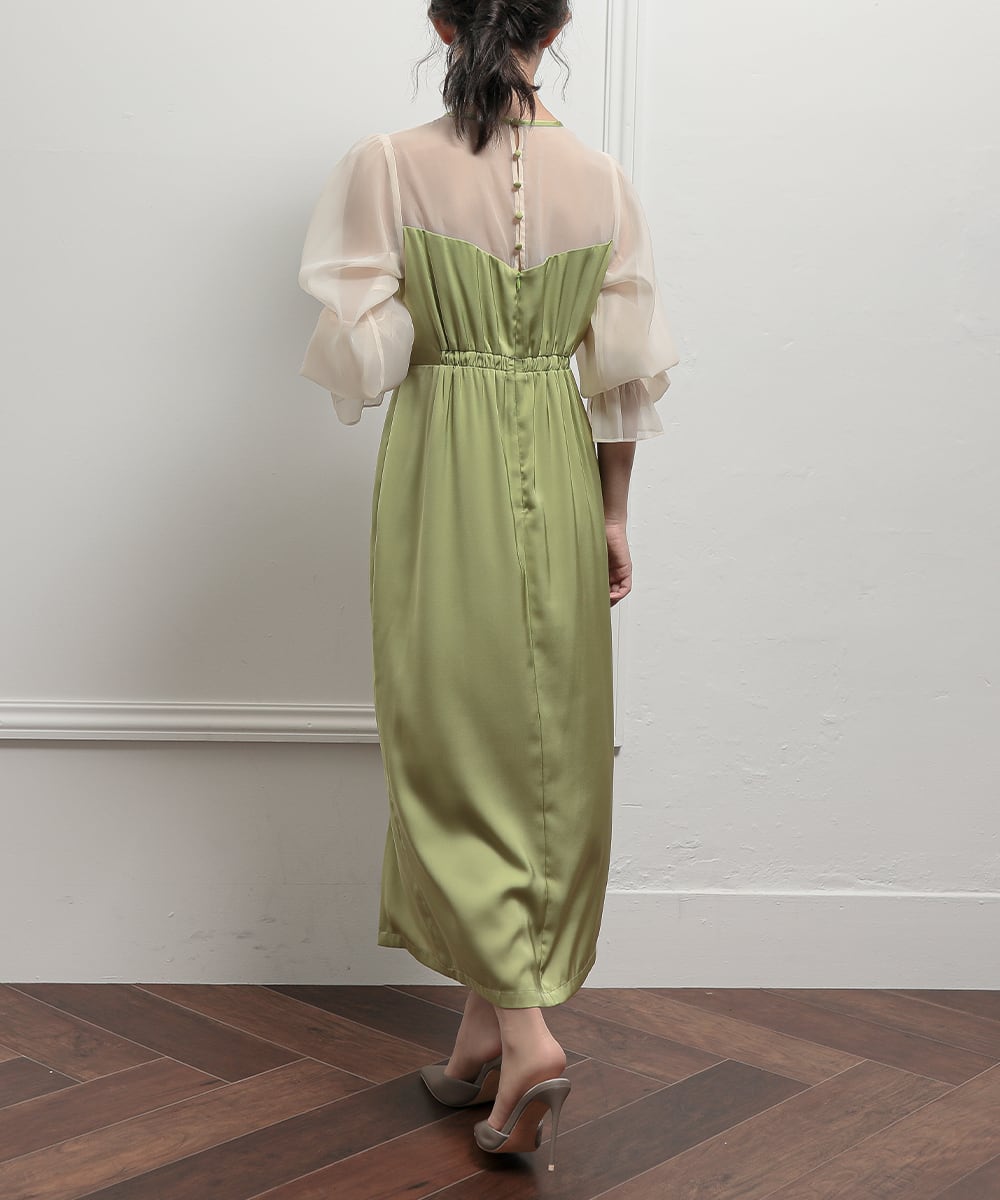 ・キャンディスリーブ、サテン素材が愛らしい印象を与えますが、 スカート部分はタイトに仕上げているので可愛くなりすぎずカッコいい雰囲気もあります。